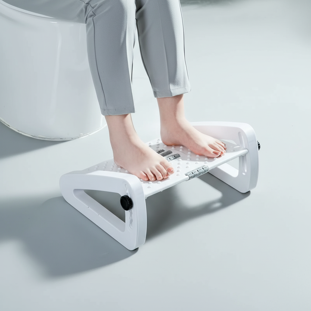 Enfin, pour un repose-pied toilette, placez-le au sol devant vos pieds afin d’adopter une position accroupie plus naturelle, bénéfique pour la digestion et le confort intestinal.