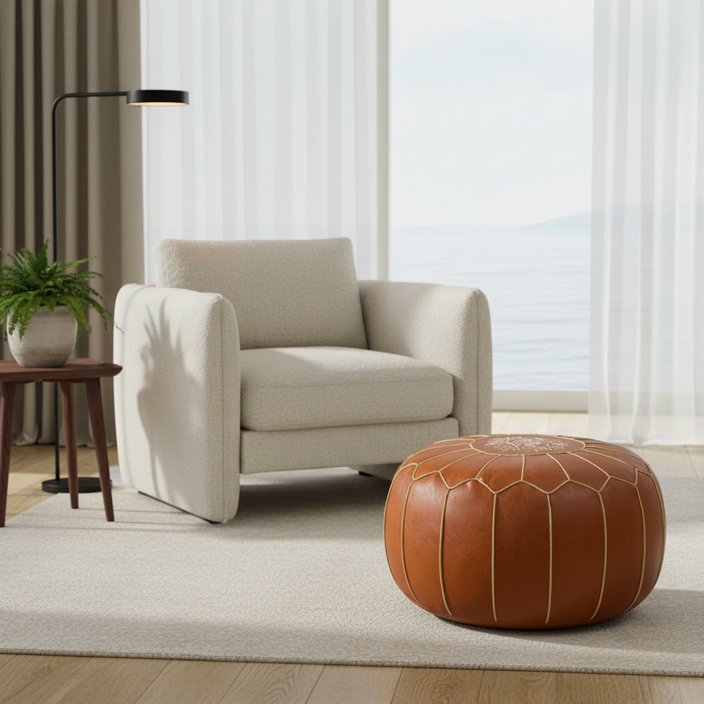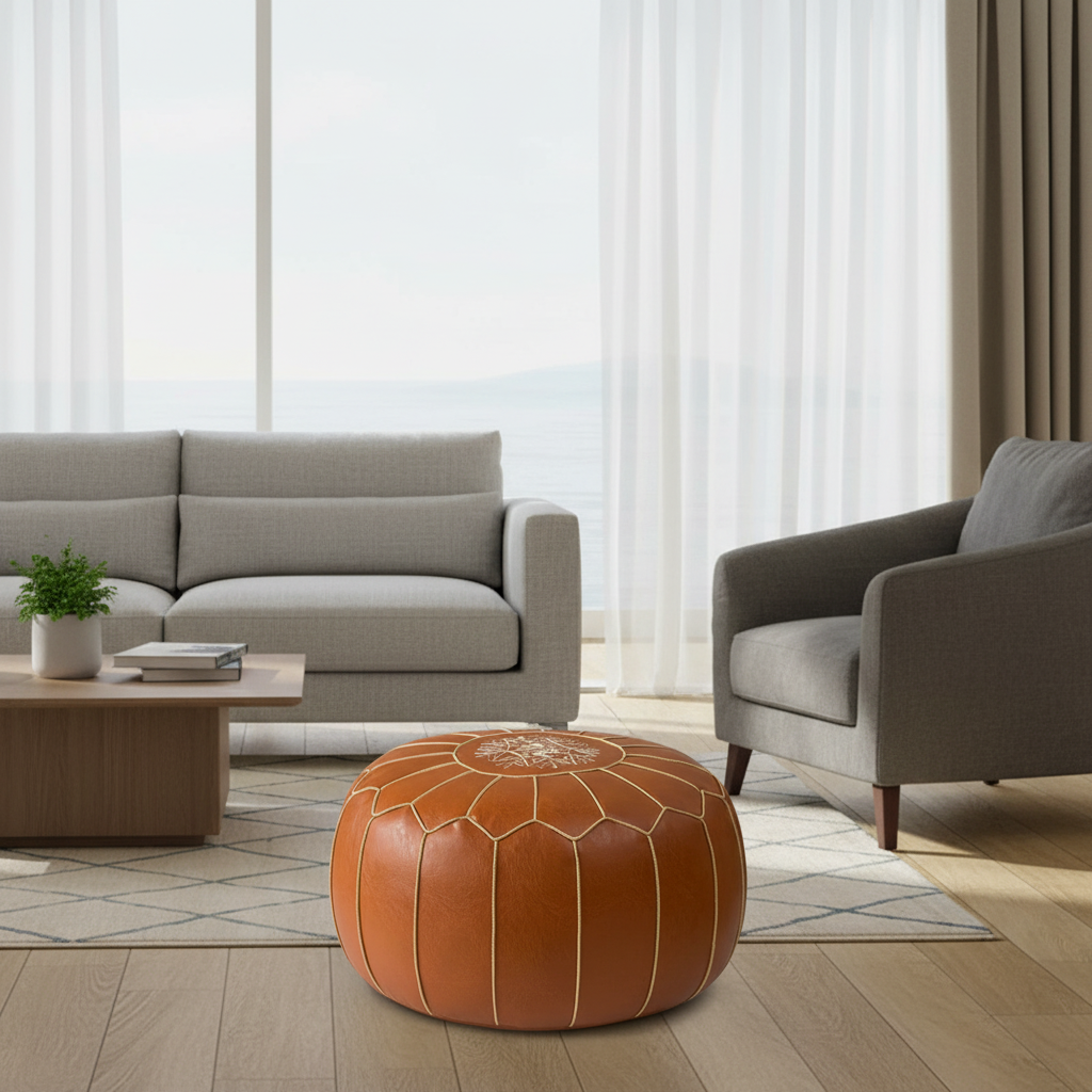 - Dimensions : À spécifier (diamètre et hauteur typiques d'un pouf compact). Poids vide minimal.