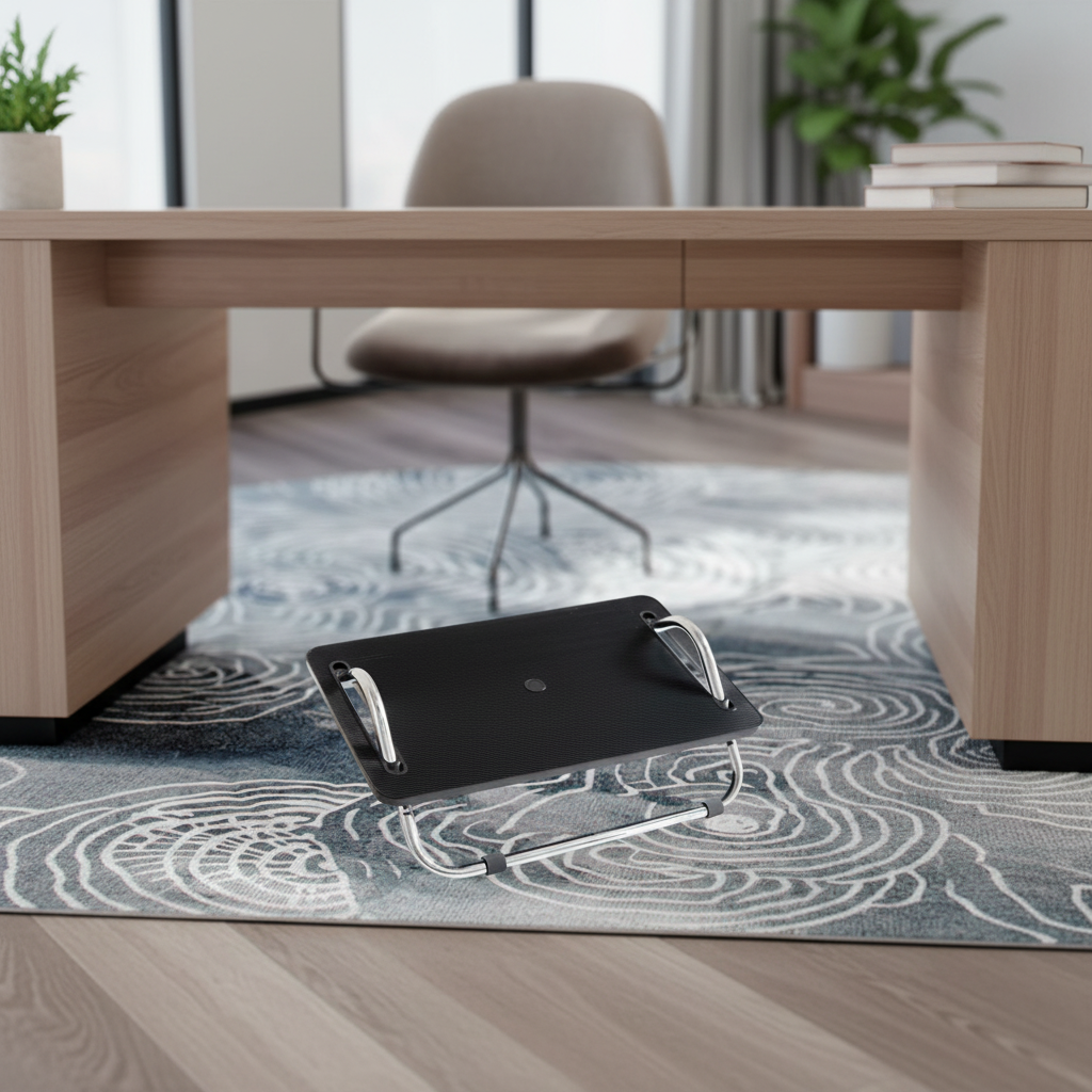 L'utilisation de ce repose-pied permet de réduire la compression sur le bas du dos et d'atténuer l'inconfort lié aux longues périodes assises. Il contribue à maintenir un angle de cheville adapté, favorisant une posture plus détendue et une meilleure concentration durant les heures de travail.