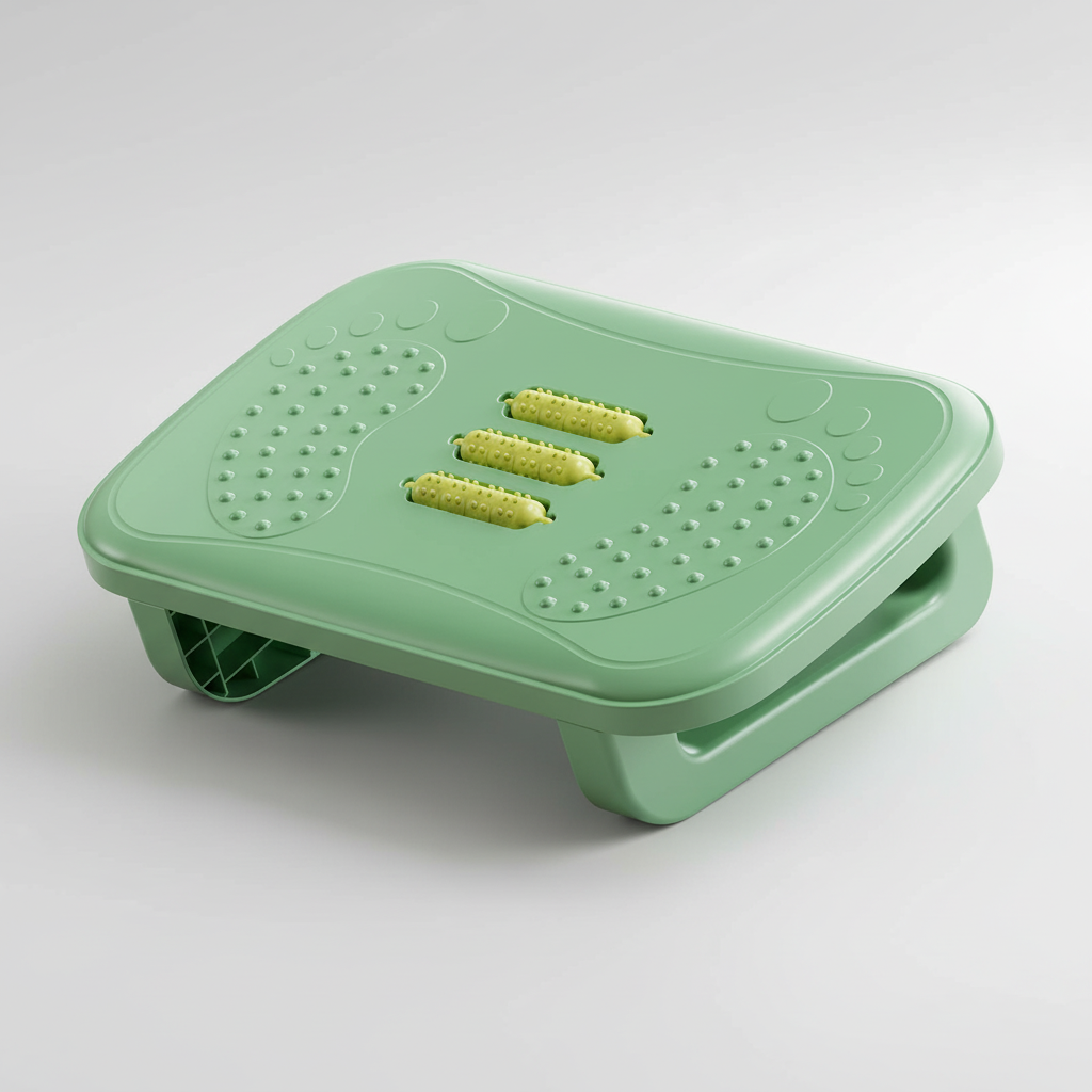 Ce repose-pied ergonomique de couleur verte est conçu pour améliorer le confort et le soutien des pieds et des jambes en position assise. Il intègre une surface texturée et des rouleaux de massage pour stimuler la circulation et réduire la fatigue.