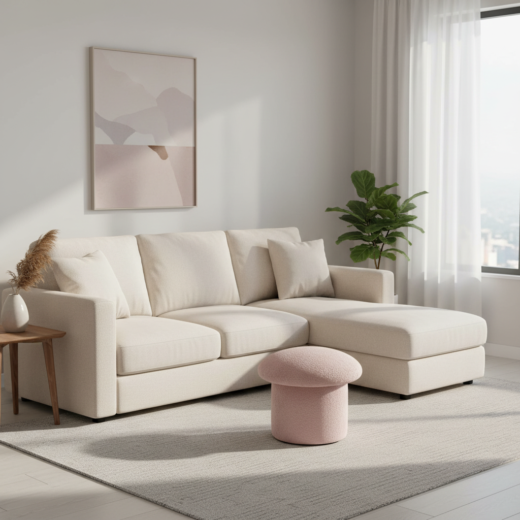 - Matière : Revêtement en tissu effet laine bouclée (lamb wool fabric), rembourrage en éponge haute résilience et structure interne stable.