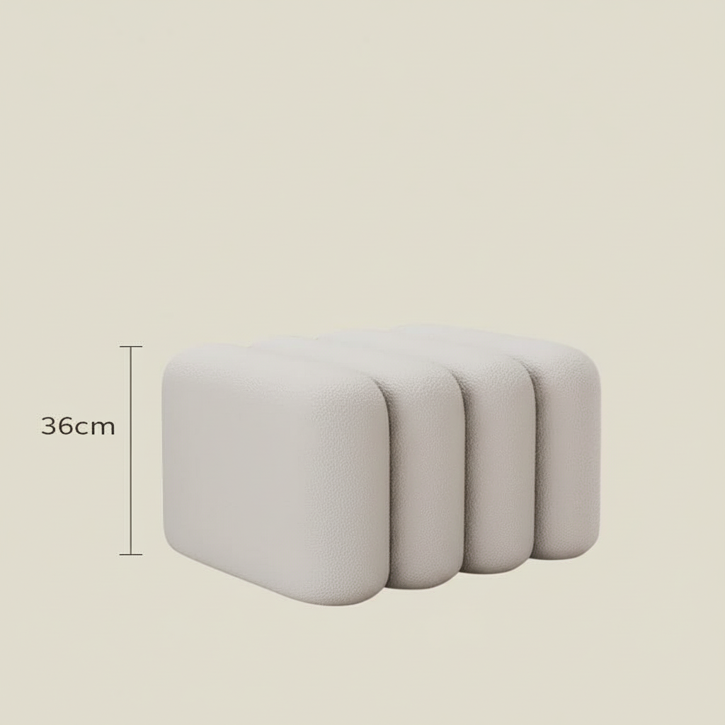 Ce Repose Pied Moderne est un meuble d'appoint rembourré, caractérisé par son esthétique minimaliste et ses formes arrondies segmentées. Il est conçu pour offrir un soutien confortable aux pieds.