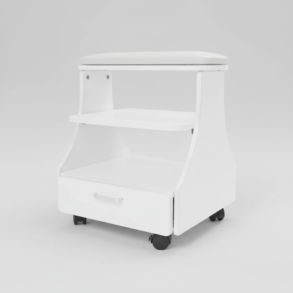 Ce Repose Pied Pédicure blanc rembourré manucure est un équipement mobile conçu pour les soins des pieds et des mains. Il intègre un coussinet confortable et des solutions de rangement pratiques pour les outils professionnels.