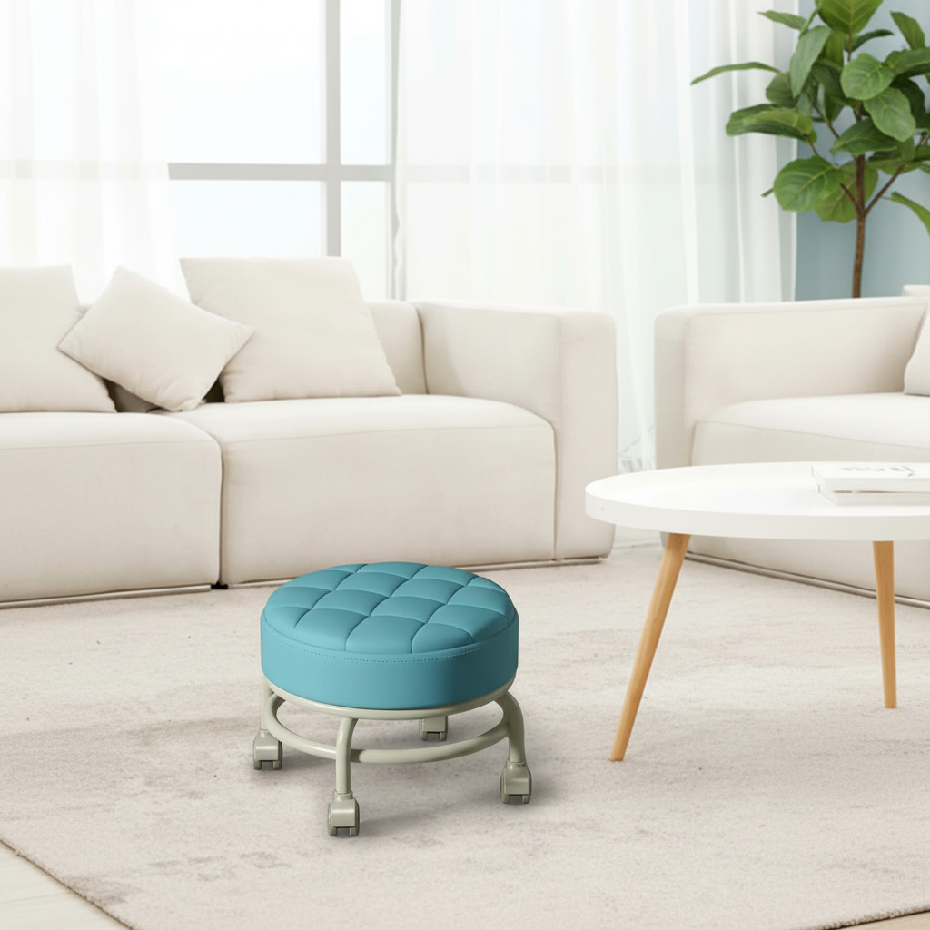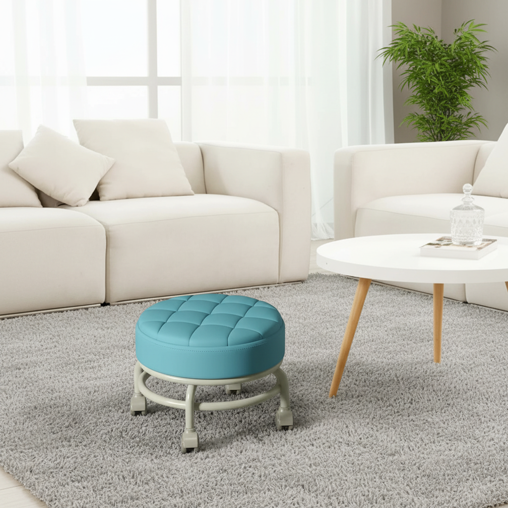 Ce repose pied pédicure bleu à roulettes est un tabouret bas rond, rembourré et équipé de roulettes pivotantes à 360 degrés. Il offre un soutien stable et une grande mobilité pour divers usages.