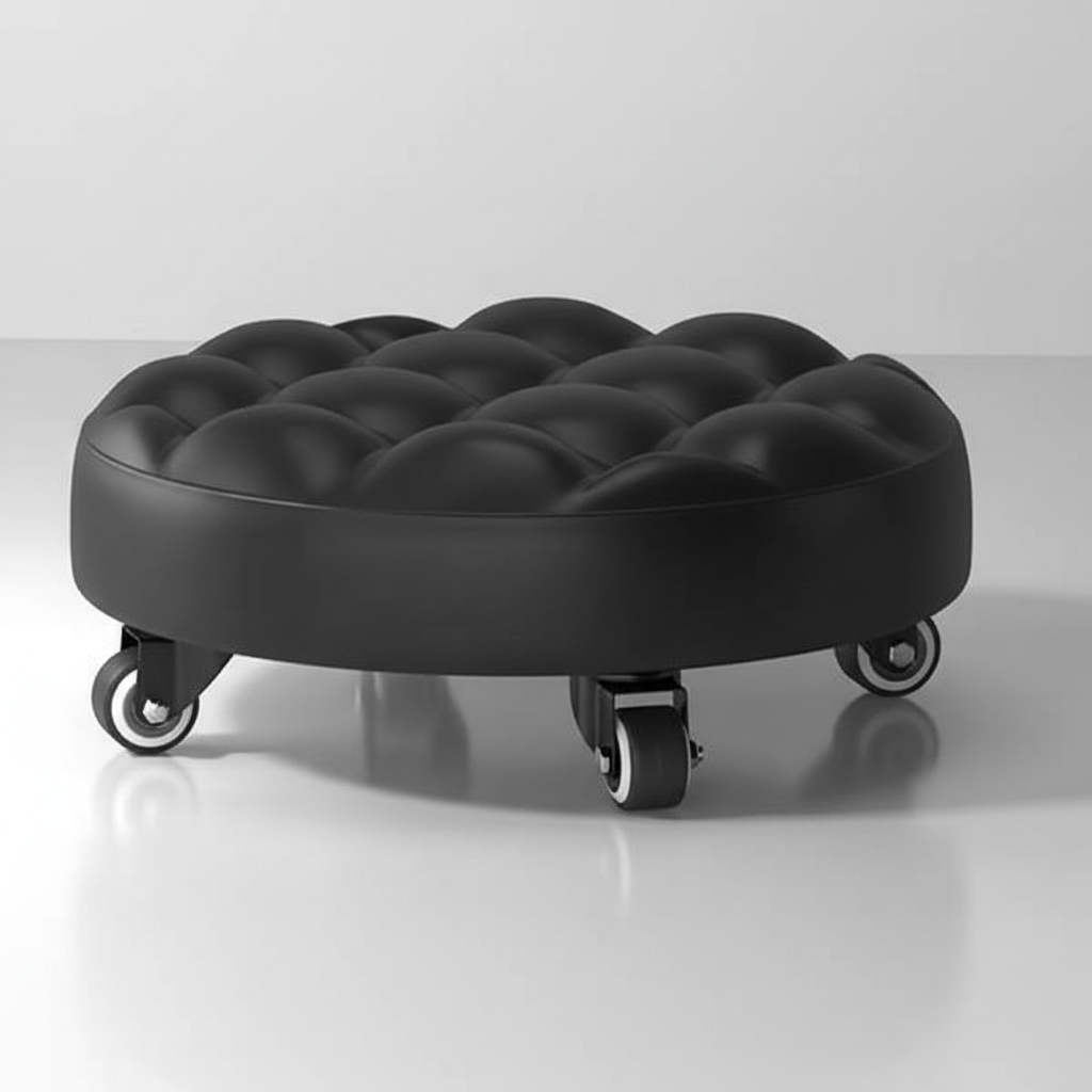 Ce repose pied bas et rond, recouvert de cuir PU noir capitonné, est équipé de roulettes pivotantes pour une mobilité aisée. Il fournit un soutien stable et confortable pour les pieds et les genoux lors de diverses activités.