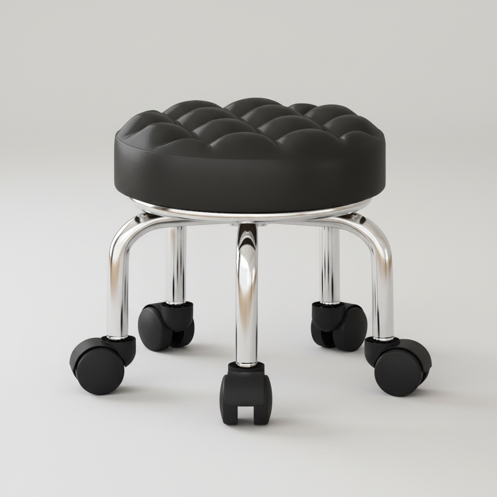 - Matière : Le coussin est en similicuir noir avec un rembourrage en mousse. La structure est en métal chromé et les roulettes sont en plastique résistant.