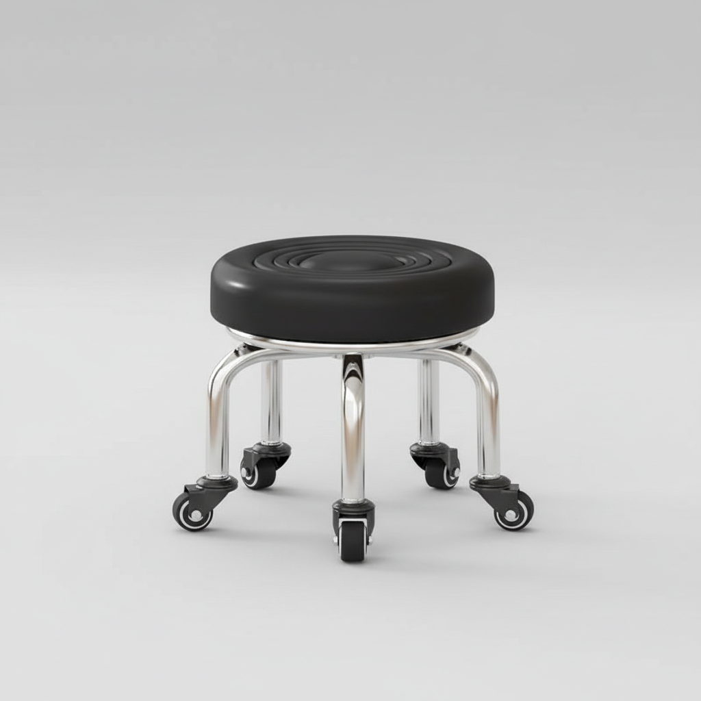 - Matière : Coussin en similicuir (PU) noir, structure en métal chromé, roulettes en plastique.