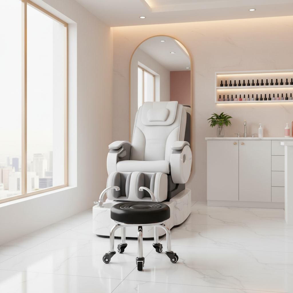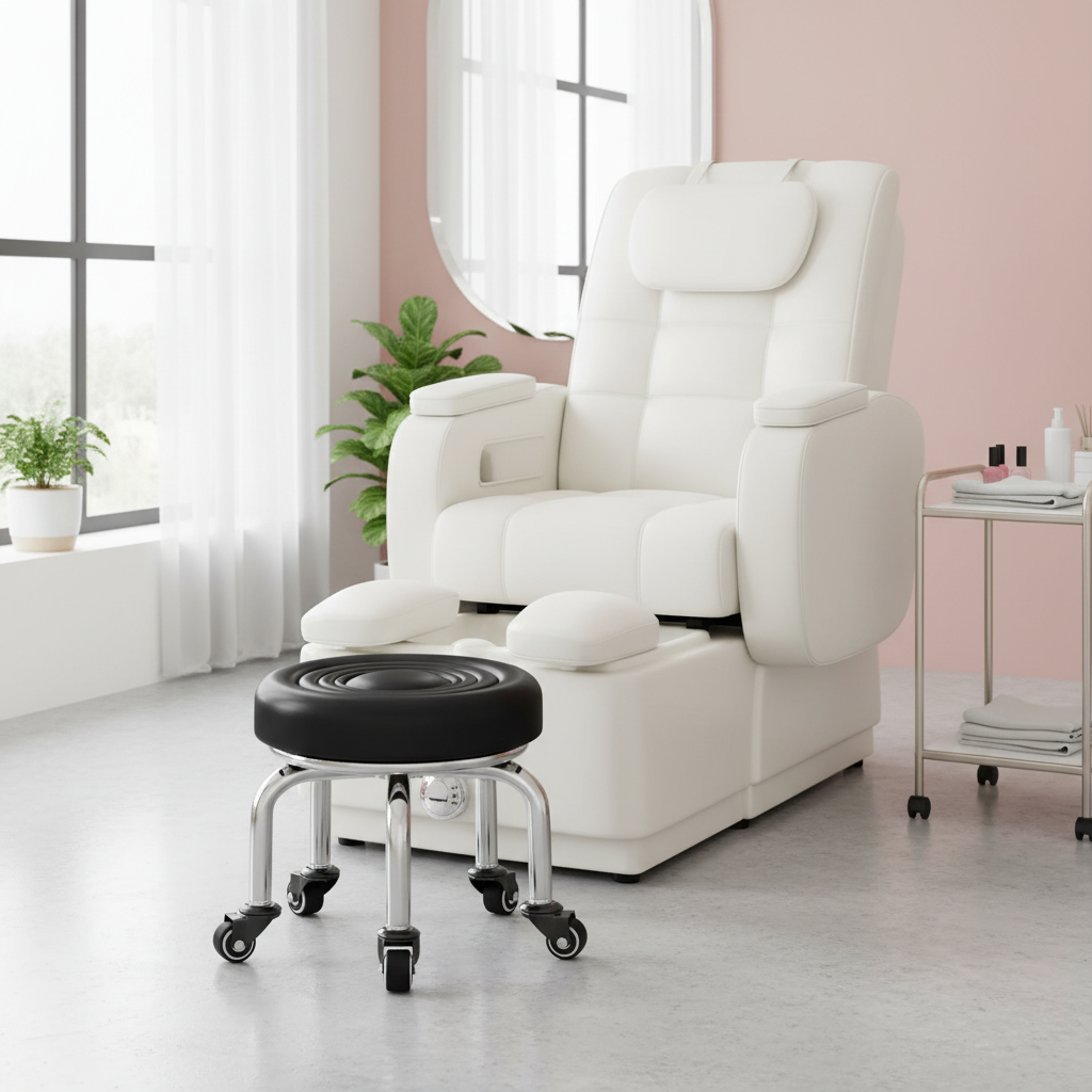 Ce repose pied facilite le positionnement ergonomique du pied du client pendant les traitements, permettant au professionnel un accès optimal. Sa conception avec roulettes assure un ajustement rapide et sans effort dans l'espace de travail du spa ou du salon.