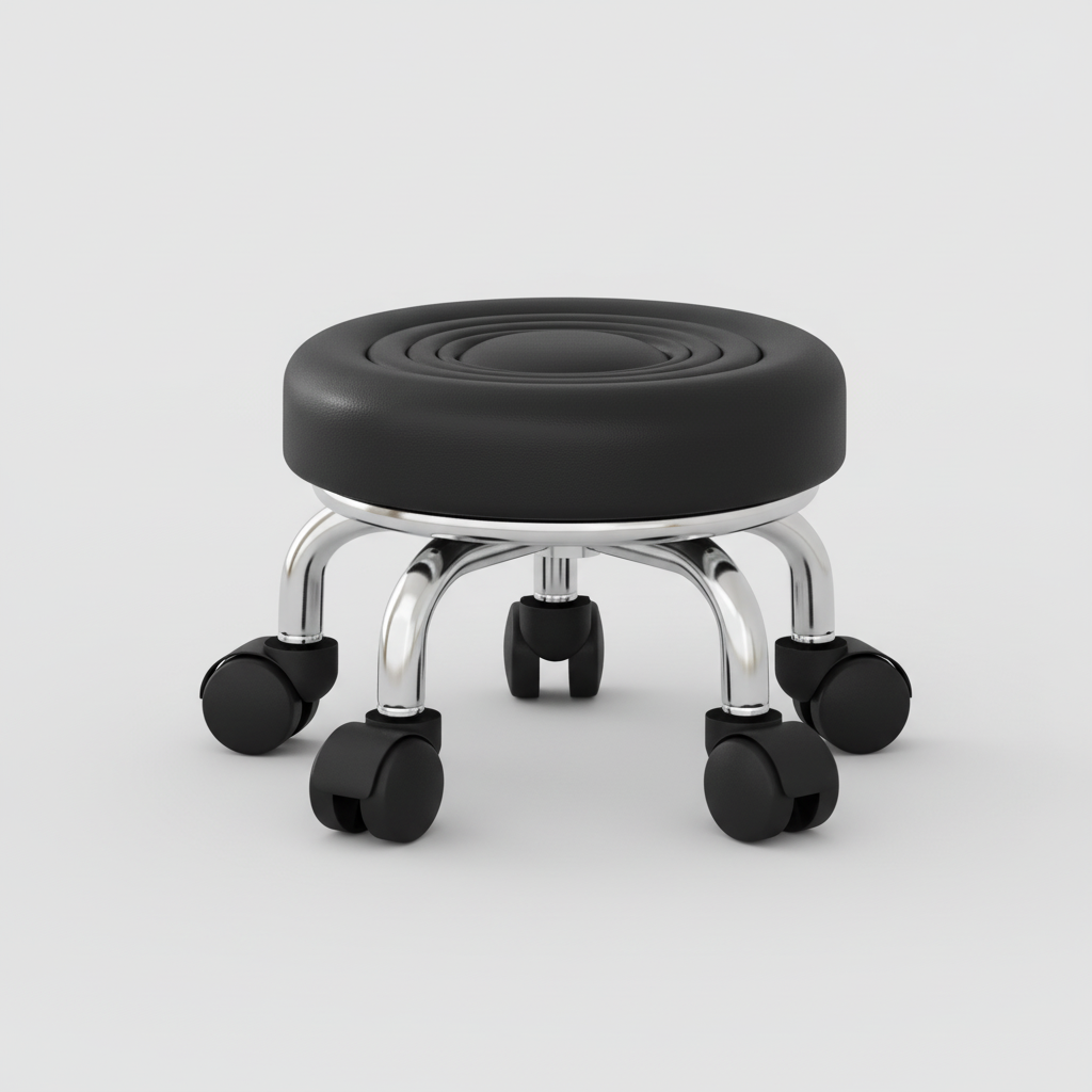 - Matière : Coussin en similicuir noir, base en métal chromé, roulettes en plastique.