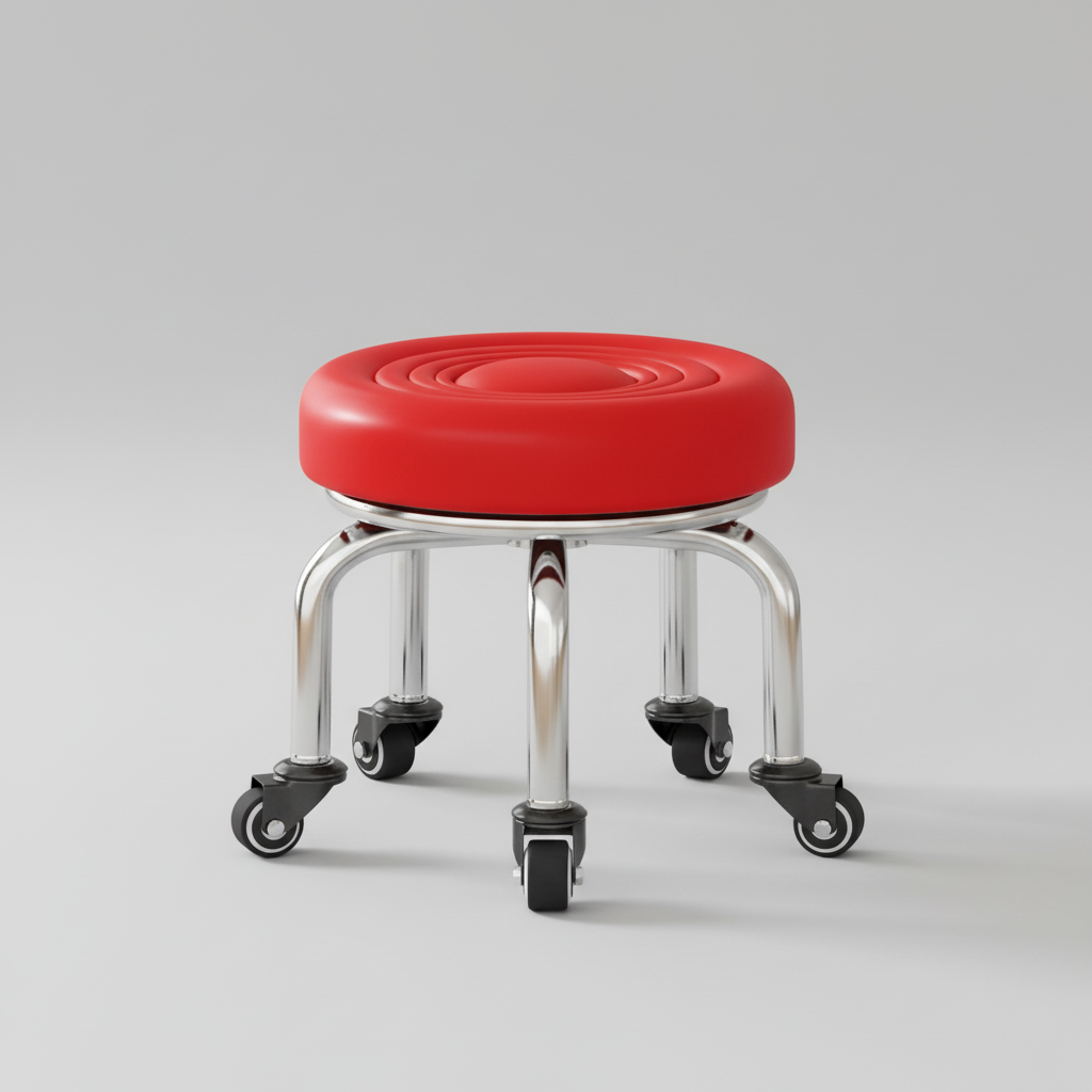 - Matière : Assise en revêtement synthétique (PU) rouge, structure en métal chromé, roulettes en plastique.