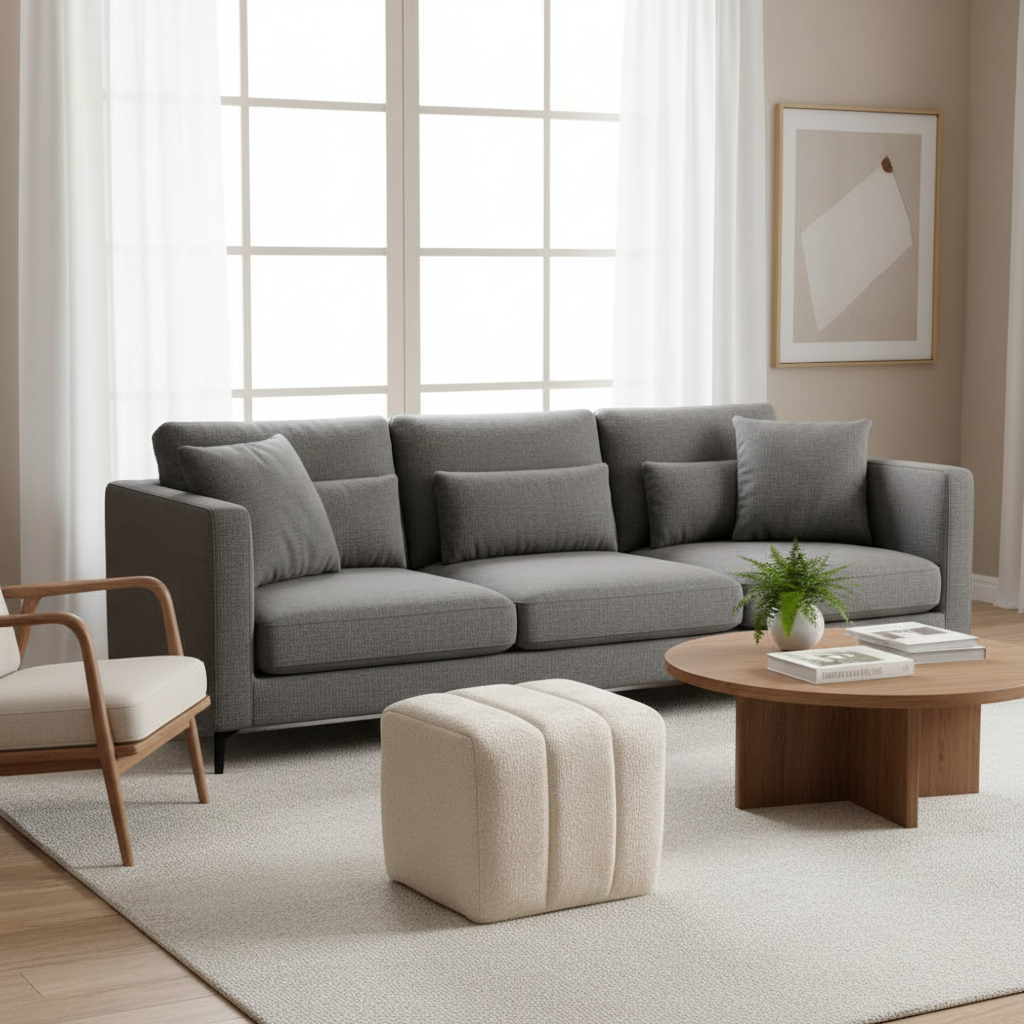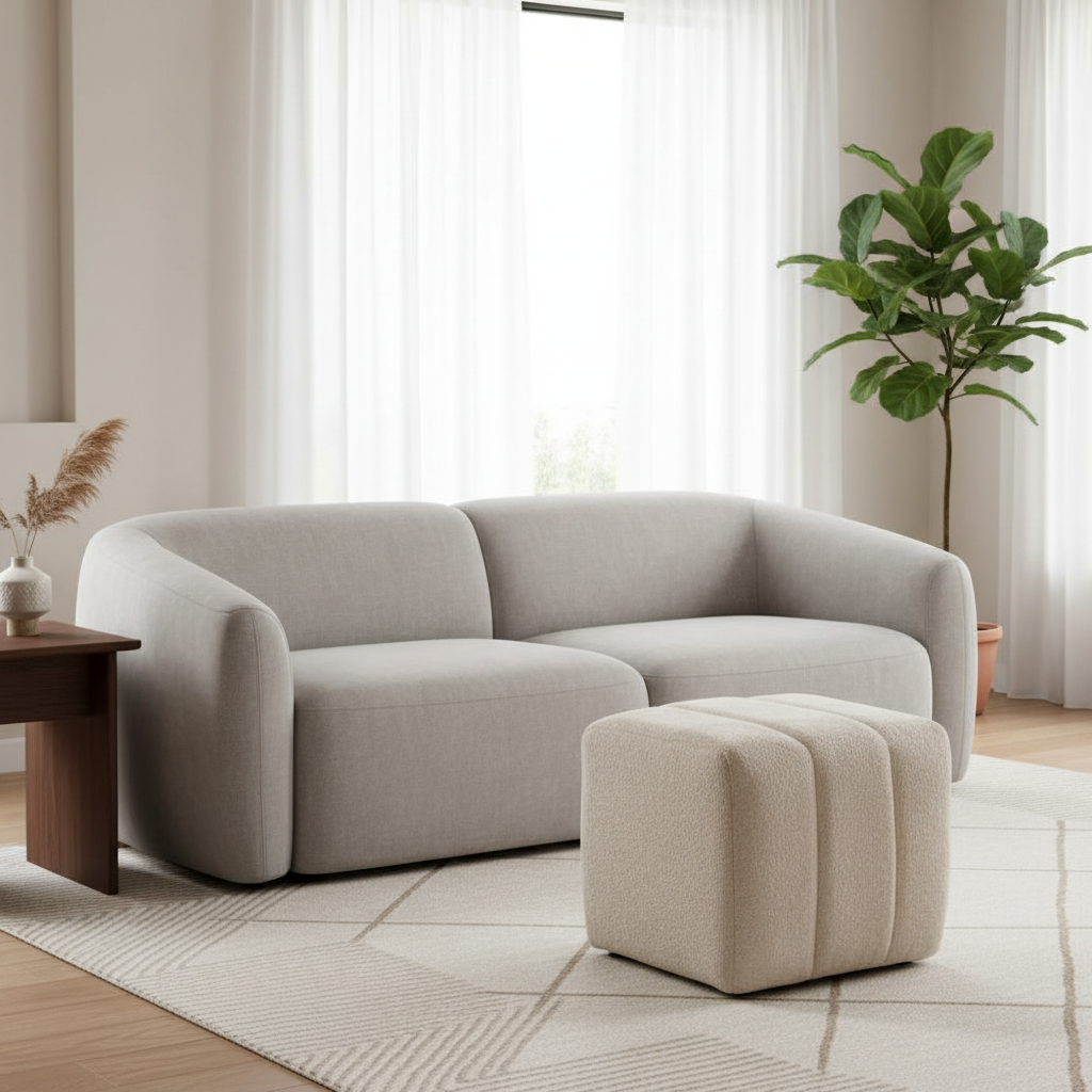 - Matière : Tissu bouclé (polyester), rembourrage en mousse de densité moyenne, structure interne stable (bois composite).