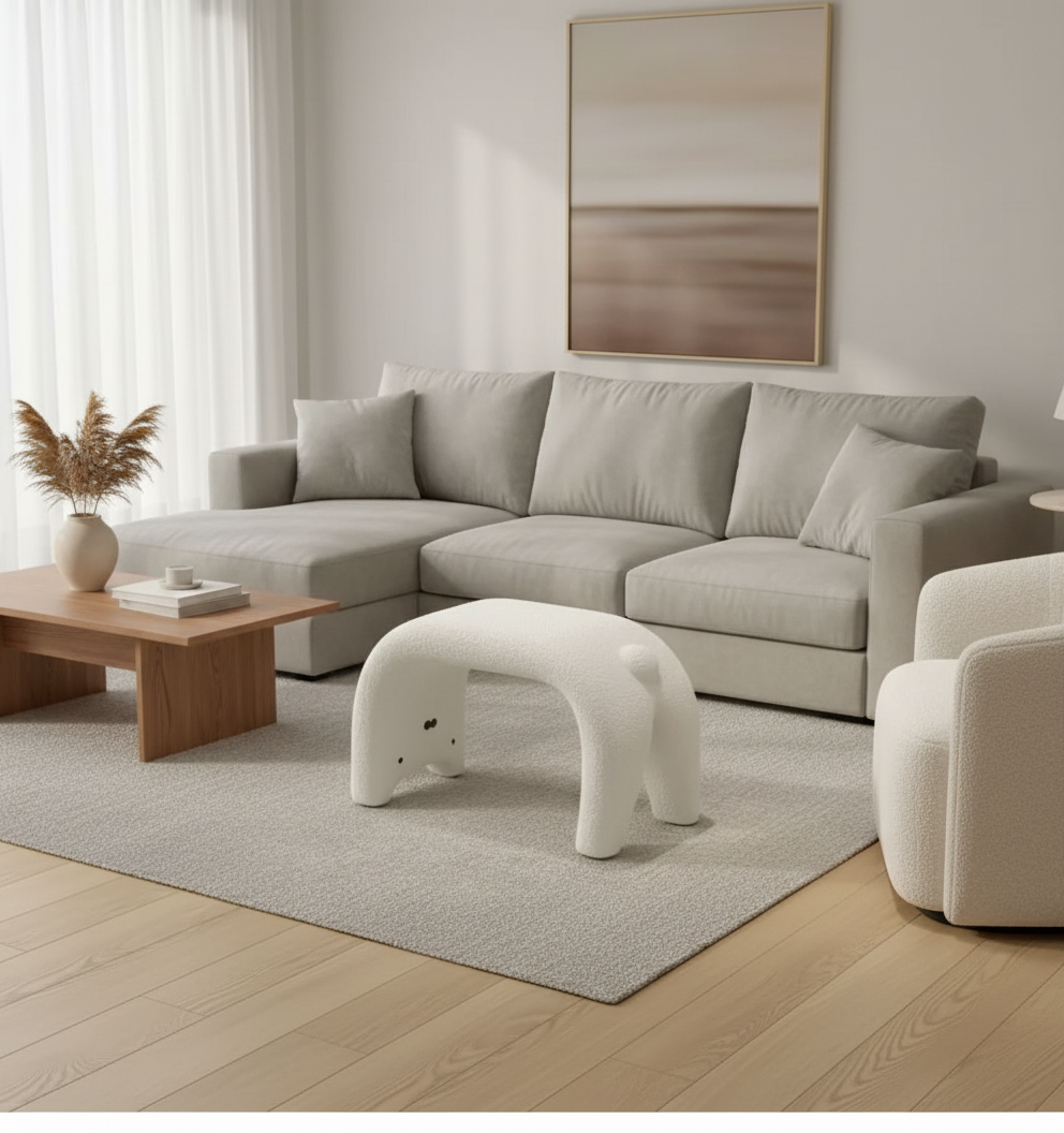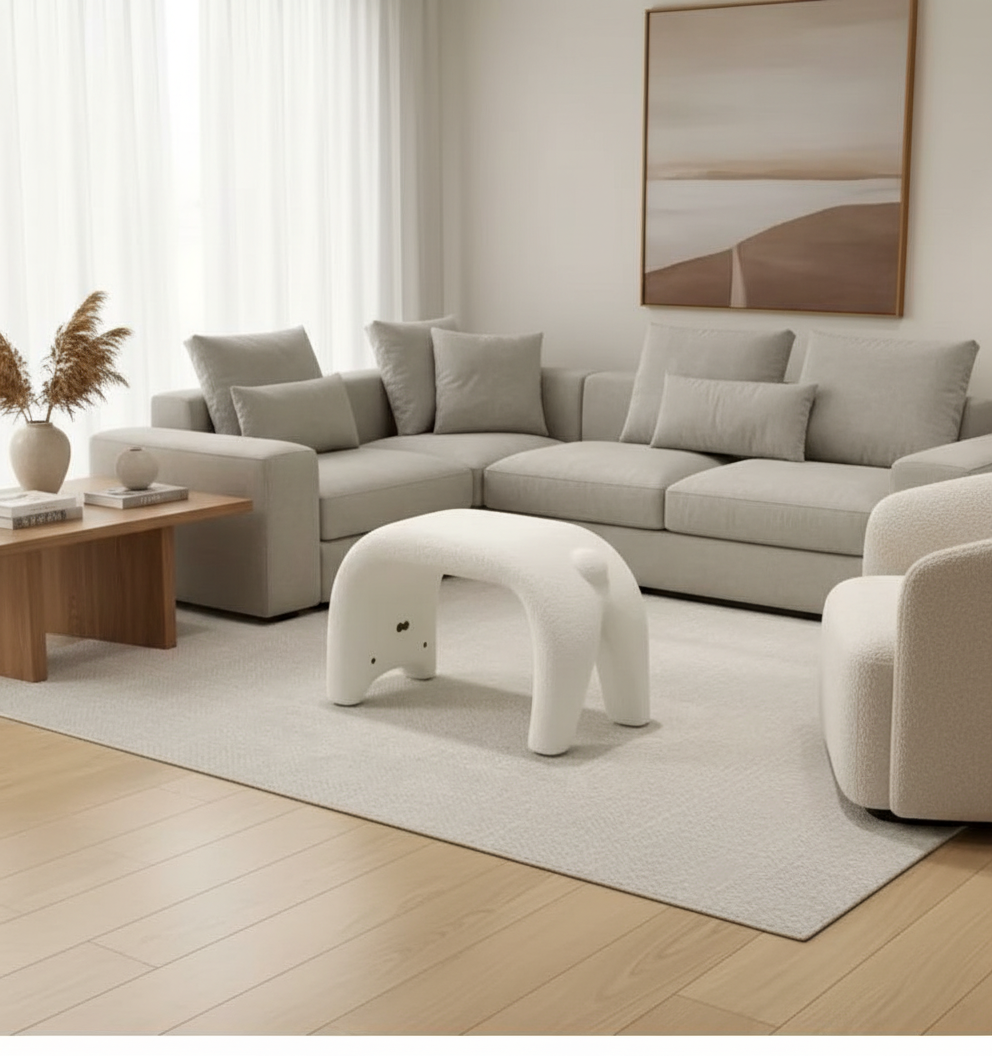 Repose Pied Salon blanc bouclé canapé : Design animalier et confort texturé