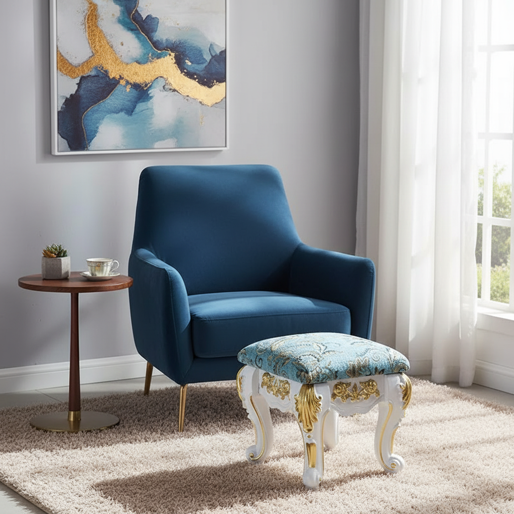Ce repose pied de salon présente un cadre sculpté blanc et doré, complété par un coussin en tissu à motifs bleus. Il est conçu pour s'intégrer dans un intérieur classique à côté d'un canapé.