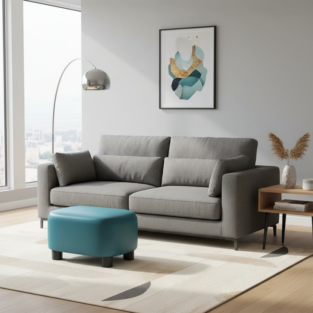 - Matière : Tissu rembourré (simili-cuir ou polyester durable), structure interne en bois, pieds en plastique résistant.