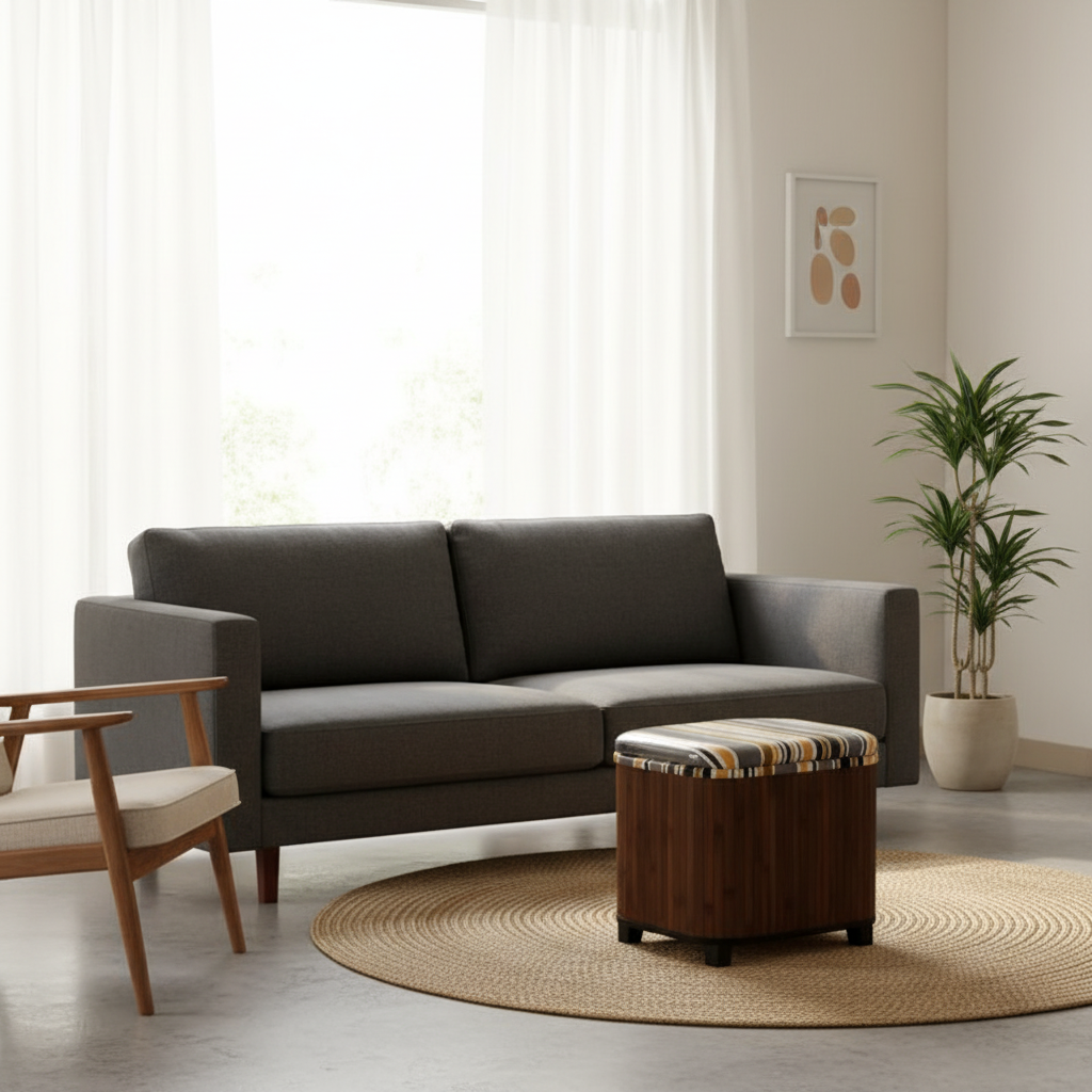 Ce repose pied carré en bois massif et bambou offre une assise confortable et intègre un espace de rangement discret. Il est conçu pour une utilisation polyvalente dans un salon ou une entrée, combinant fonctionnalité et esthétique.