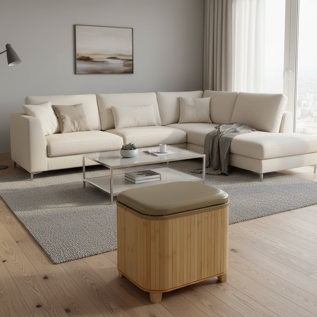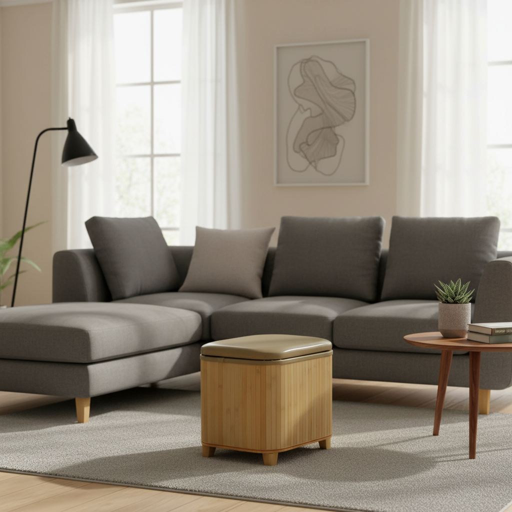- Matière : Structure principale en bois massif et parois en bambou. La surface d'assise est en PU (polyuréthane) durable. La doublure intérieure du compartiment de rangement est amovible et lavable.