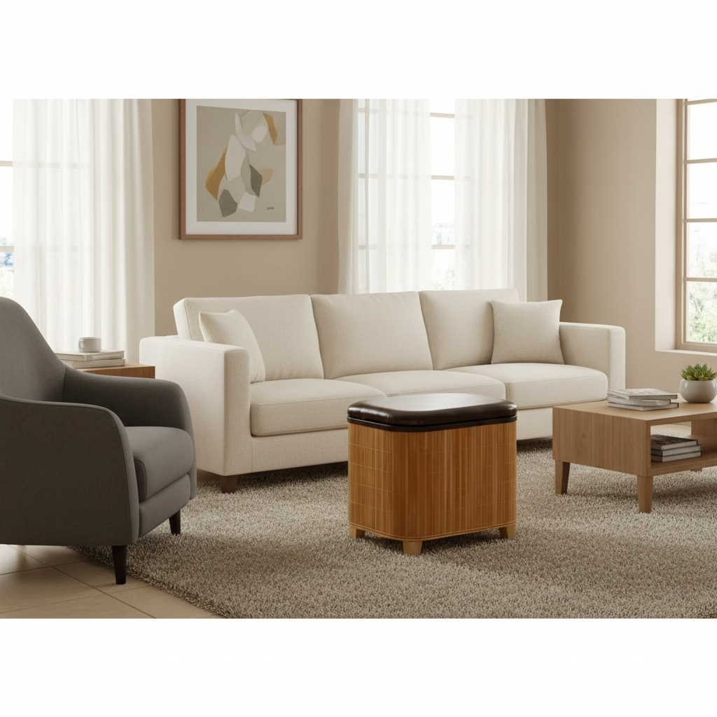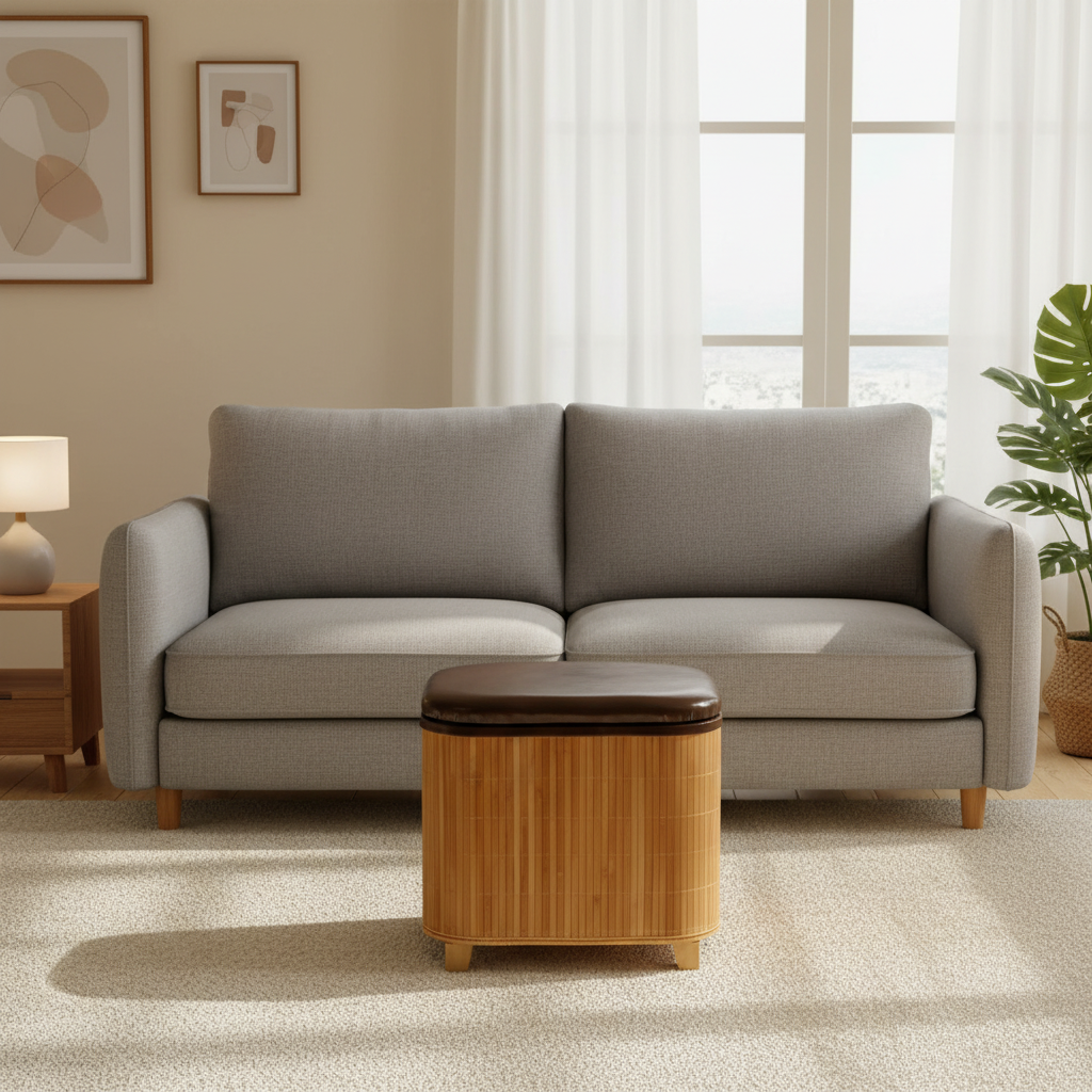 - Matière : Structure en bambou et bois massif, assise rembourrée avec revêtement en PU marron foncé. La doublure intérieure du rangement est amovible.