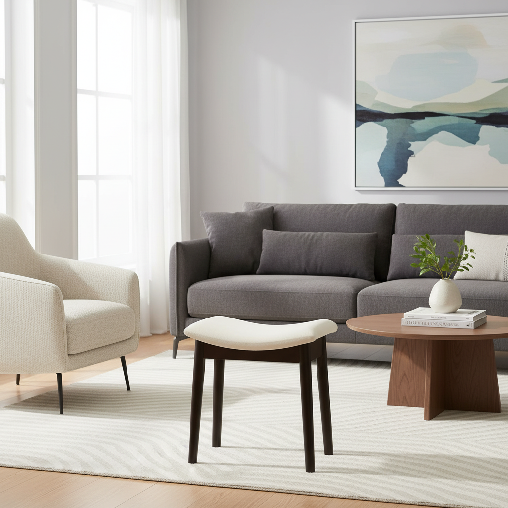 Ce repose pied offre une assise courbée et rembourrée de couleur crème, soutenue par une structure en bois massif. Il est conçu pour procurer un soutien ergonomique ou servir de siège d'appoint.