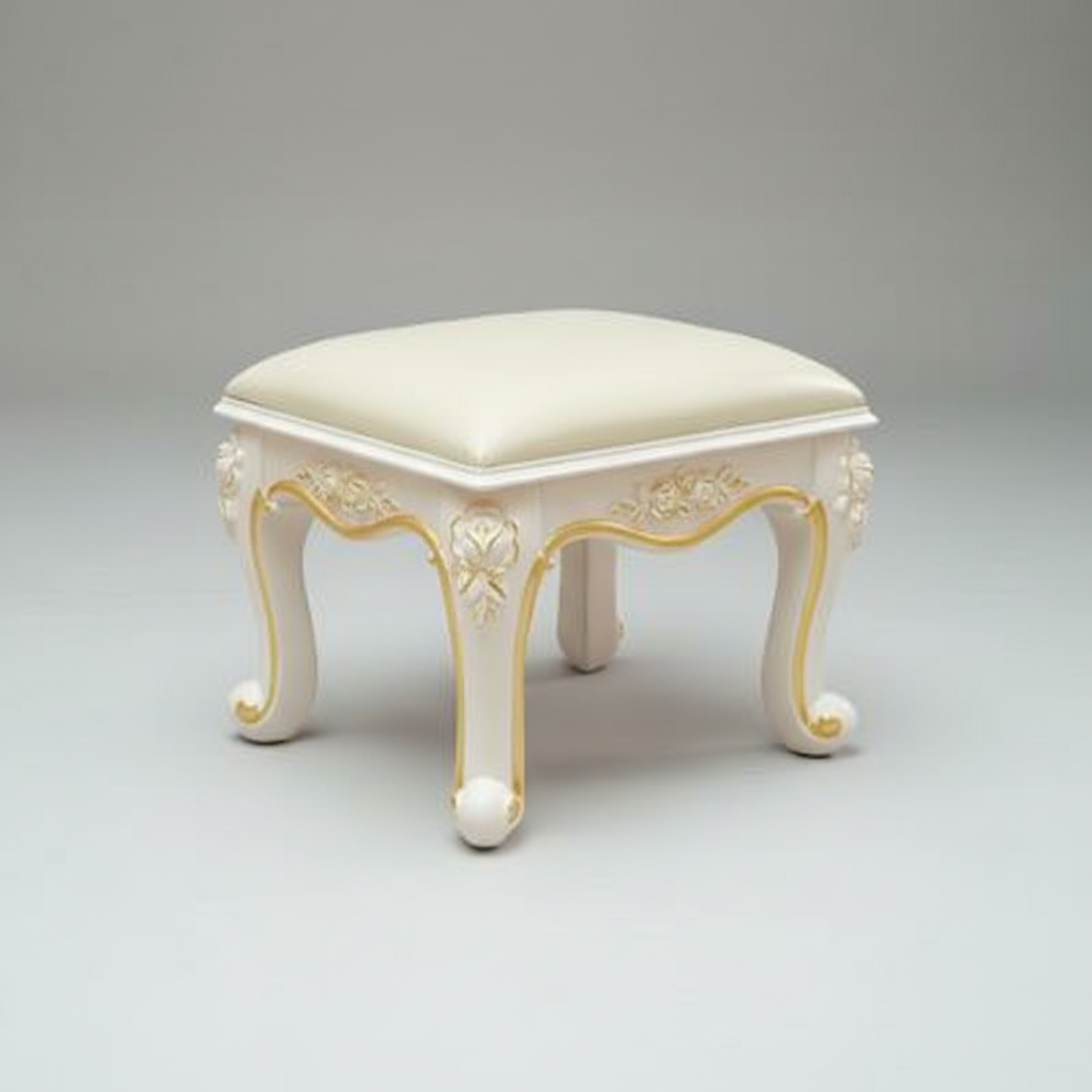 Ce repose pied se caractérise par son coussin rembourré de couleur crème et sa structure sculptée avec des détails dorés. Il est conçu pour s'intégrer dans des intérieurs de style classique ou vintage, que ce soit dans un salon ou une zone de dressing.