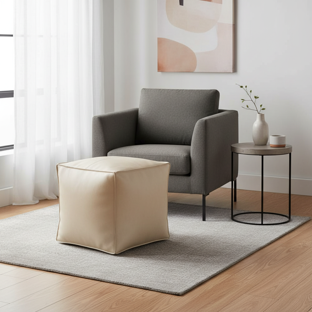 Repose Pied Salon Cuir Beige Rangement – Pouf Carré et Imperméable
