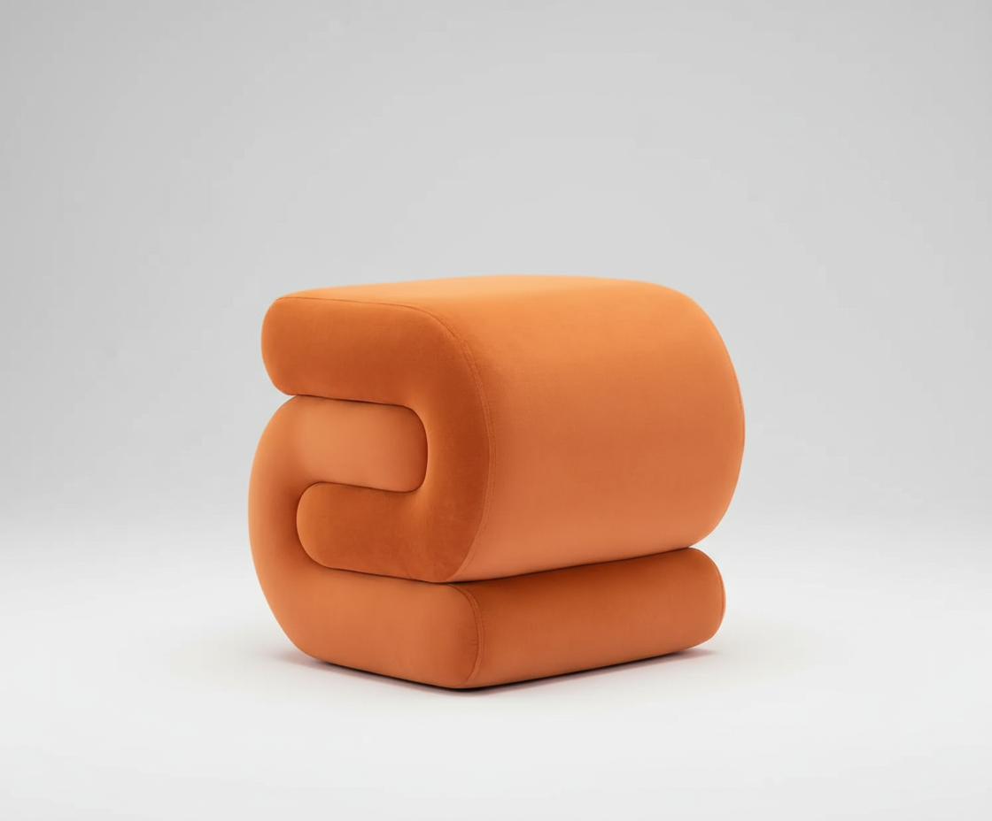 Ce repose pied en forme de S est un pouf moderne de couleur orange, conçu pour compléter un salon ou un canapé. Il sert de support pour les pieds ou d'assise d'appoint.