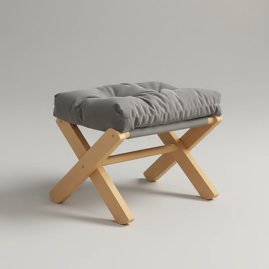 Ce repose pied combine une structure en bois clair avec un coussin capitonné gris, offrant un support confortable. Il est conçu pour s'intégrer harmonieusement dans un salon, à côté d'un canapé ou comme siège d'appoint.