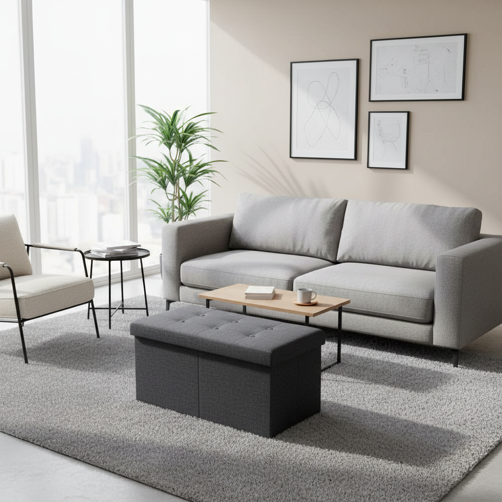 ↪︎ À propos de notre Repose Pied Salon Gris Tissu Rangement