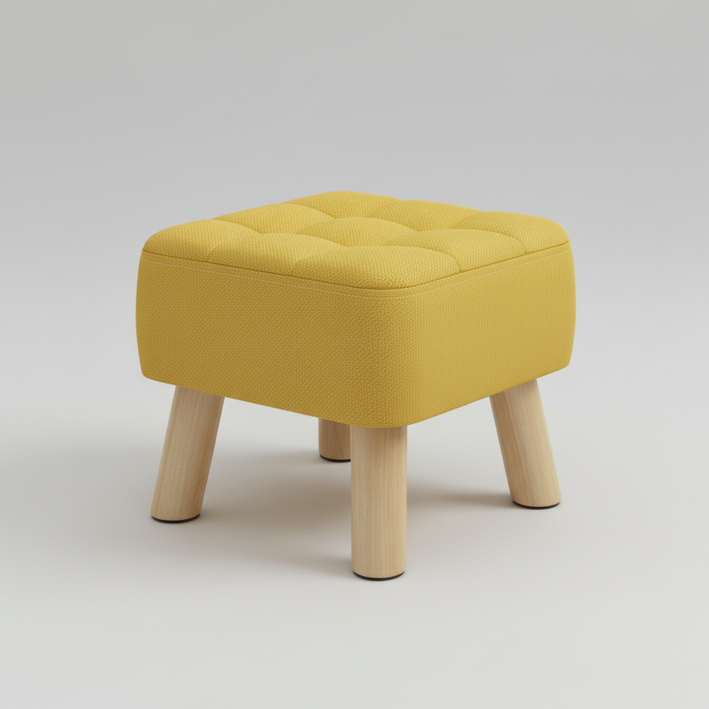 Ce repose pied carré est un élément de mobilier fonctionnel, doté d'un revêtement en tissu jaune capitonné et de quatre pieds en bois massif. Il est conçu pour s'intégrer dans divers espaces intérieurs, offrant soutien et une touche de couleur.