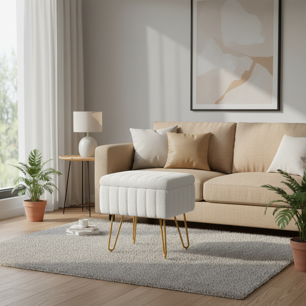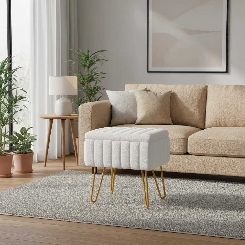 - Utilisation prévue : Ce produit est destiné à un usage domestique comme repose-pieds dans le salon, la chambre ou le bureau, comme siège d'appoint pour une table de maquillage ou coiffeuse, et comme tabouret de rangement pour petits objets.