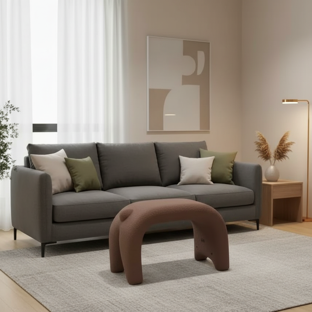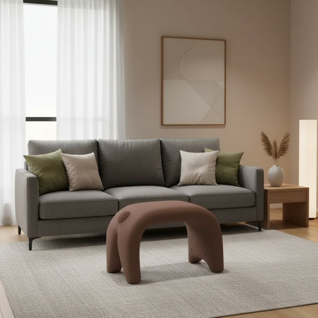 - Matière : Tissu bouclé (polyester) pour le revêtement, structure interne en bois ou composite.