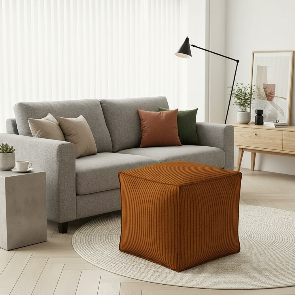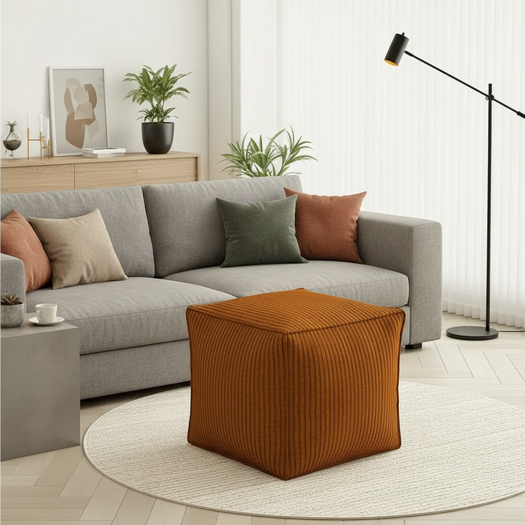 Ce repose pied Salon marron côtelé rangement est une housse de pouf carrée en tissu velours côtelé, conçue pour servir de repose-pieds ou de siège d'appoint. Il intègre une fermeture éclair discrète pour un remplissage facile, permettant également une fonction de rangement pour des textiles.