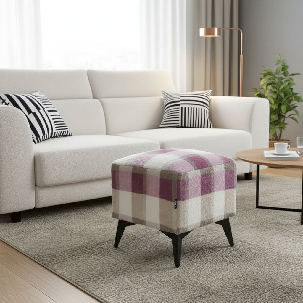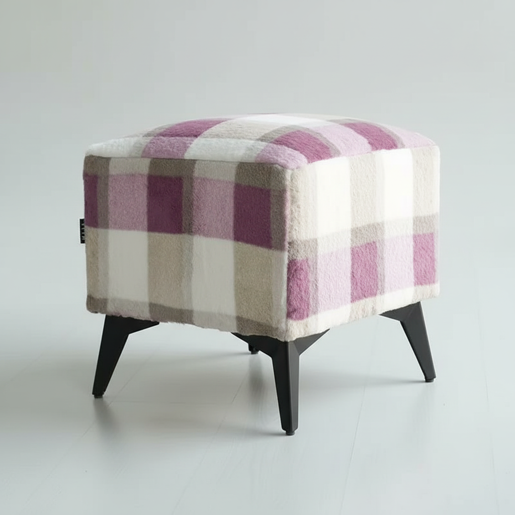 - Matière : Tissu doux type velours (polyester) à motif plaid (blanc, violet, beige), structure interne en bois robuste, pieds en métal laqué noir.