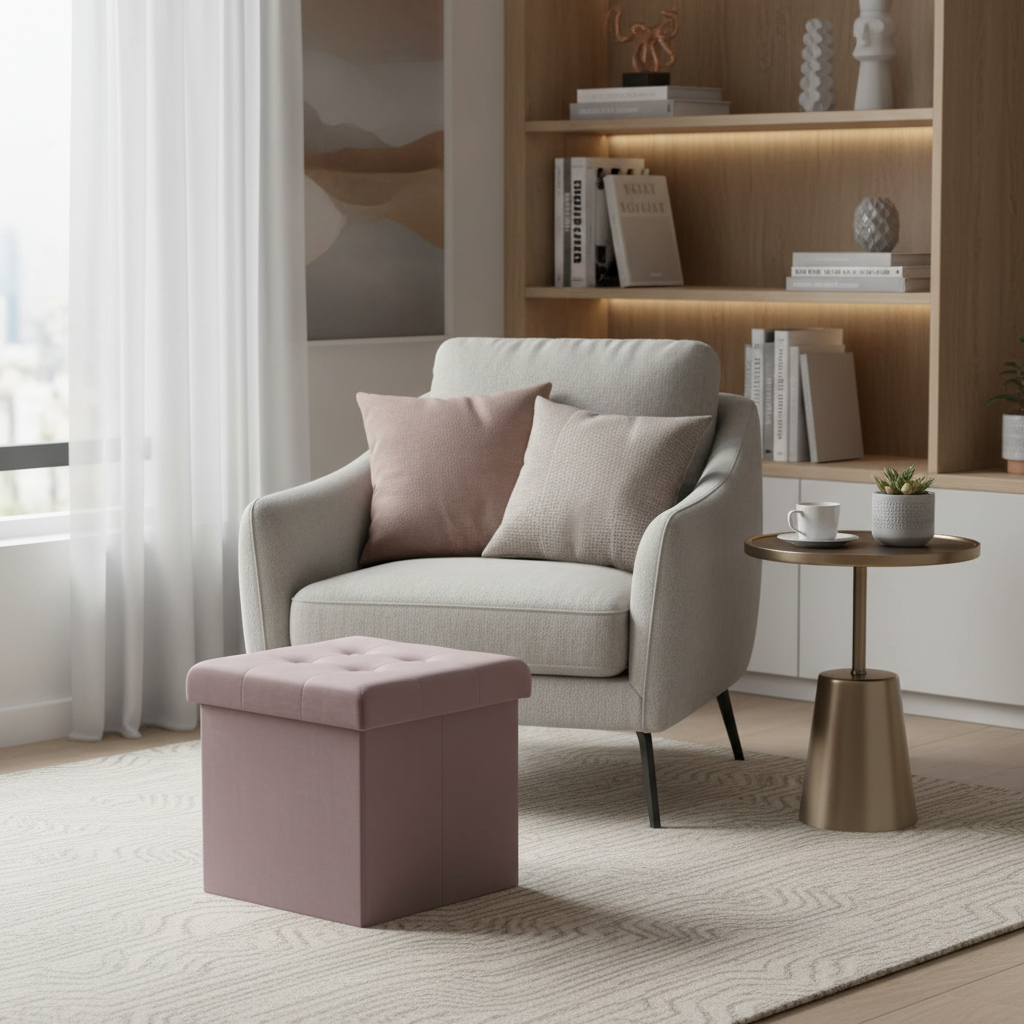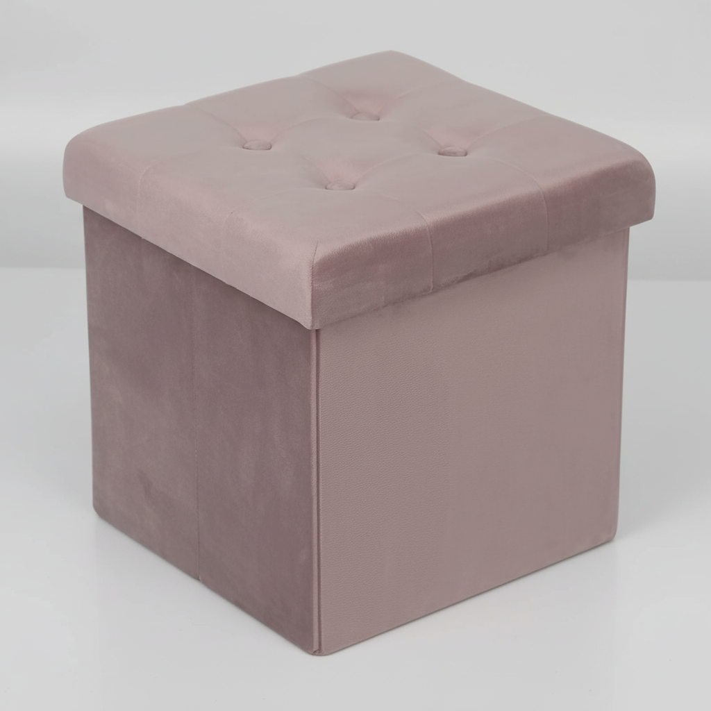 Repose Pied Salon pouf velours rose : Modèle pliable avec rangement