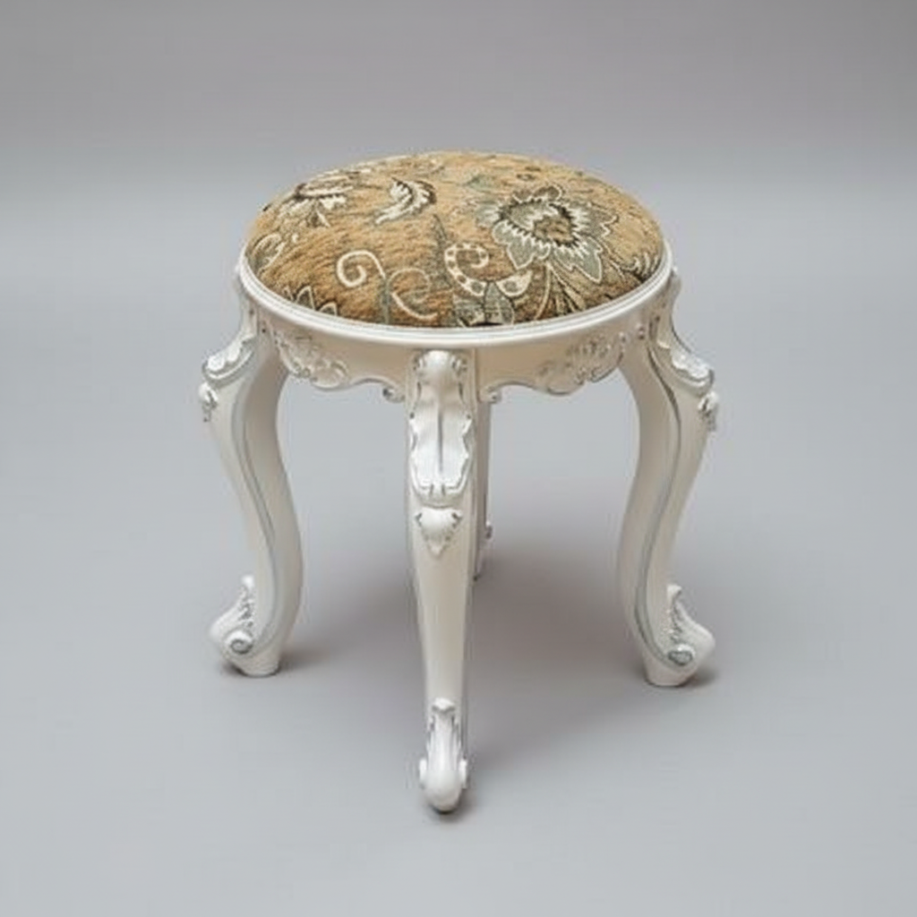 - Matière : Structure en bois sculpté laqué blanc avec accents argentés, assise rembourrée recouverte de tissu à motifs.