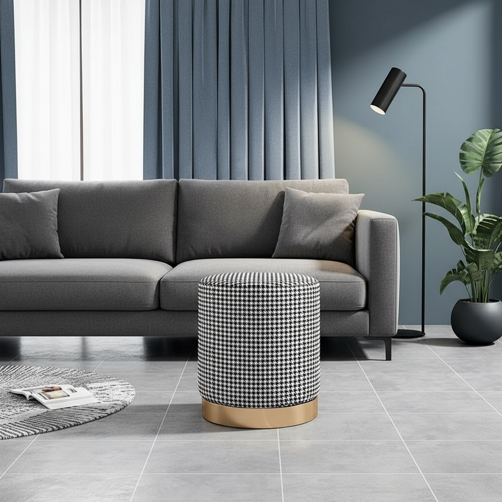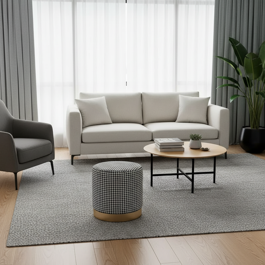Ajoutez une touche d'élégance intemporelle à votre espace avec ce repose-pieds rond au motif pied-de-poule.