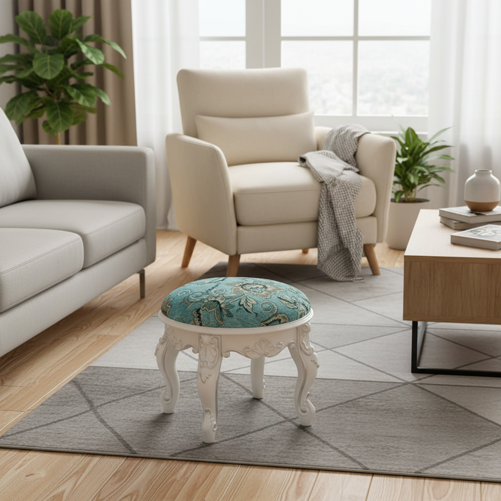 Ce repose-pieds rond en tissu jacquard, orné de motifs et doté de pieds sculptés blancs, est conçu pour s'intégrer dans un salon ou une chambre. Il offre une solution fonctionnelle et esthétique, servant de support ou de siège d'appoint.