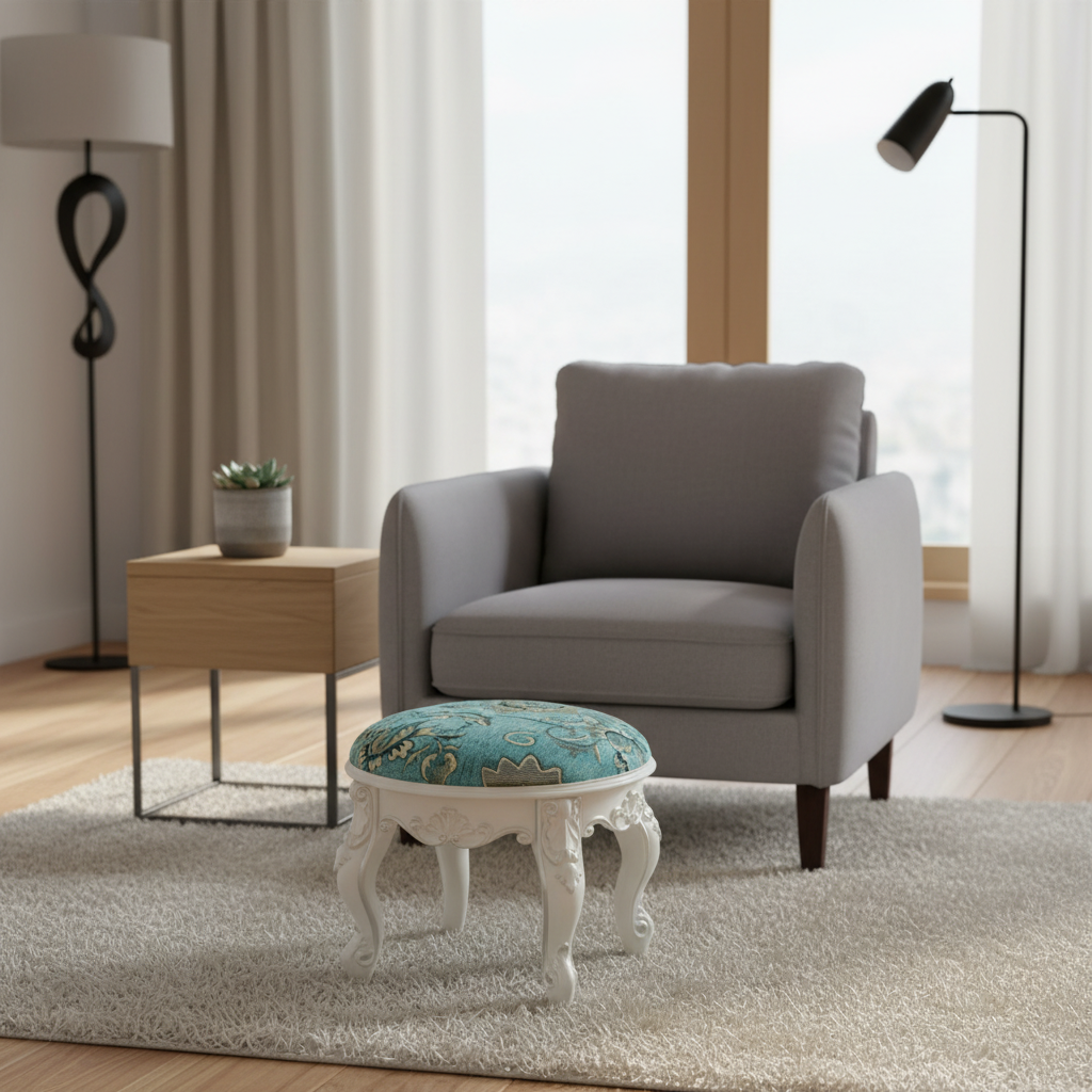 - Utilisation prévue : Domestique, principalement comme repose-pieds, siège d'appoint bas, ou tabouret de coiffeuse dans un salon, une chambre, ou un couloir.