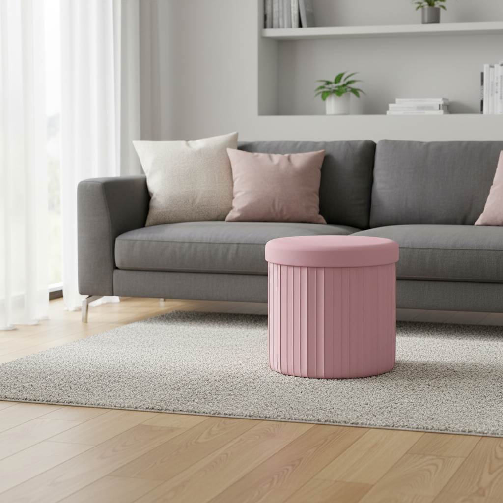 Repose Pied Salon rond velours rangement avec design côtelé et fonction de stockage