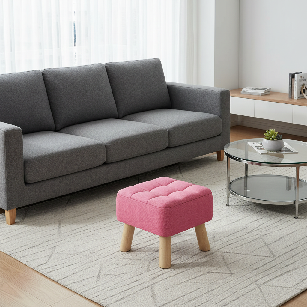 Ce repose pied de salon est un pouf carré rembourré, revêtu d'un tissu rose et soutenu par quatre pieds en bois. Il est conçu pour apporter un soutien complémentaire dans un salon, notamment pour un enfant.