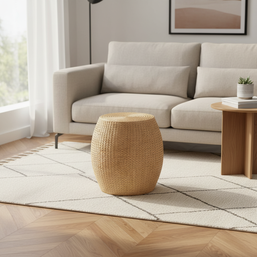 Ce repose pied de salon, fabriqué à la main, présente un tressage rond en fibres de Pu Cao sur une structure interne en bois massif. Son design naturel et sa couleur primaire s'intègrent comme un élément fonctionnel et décoratif.