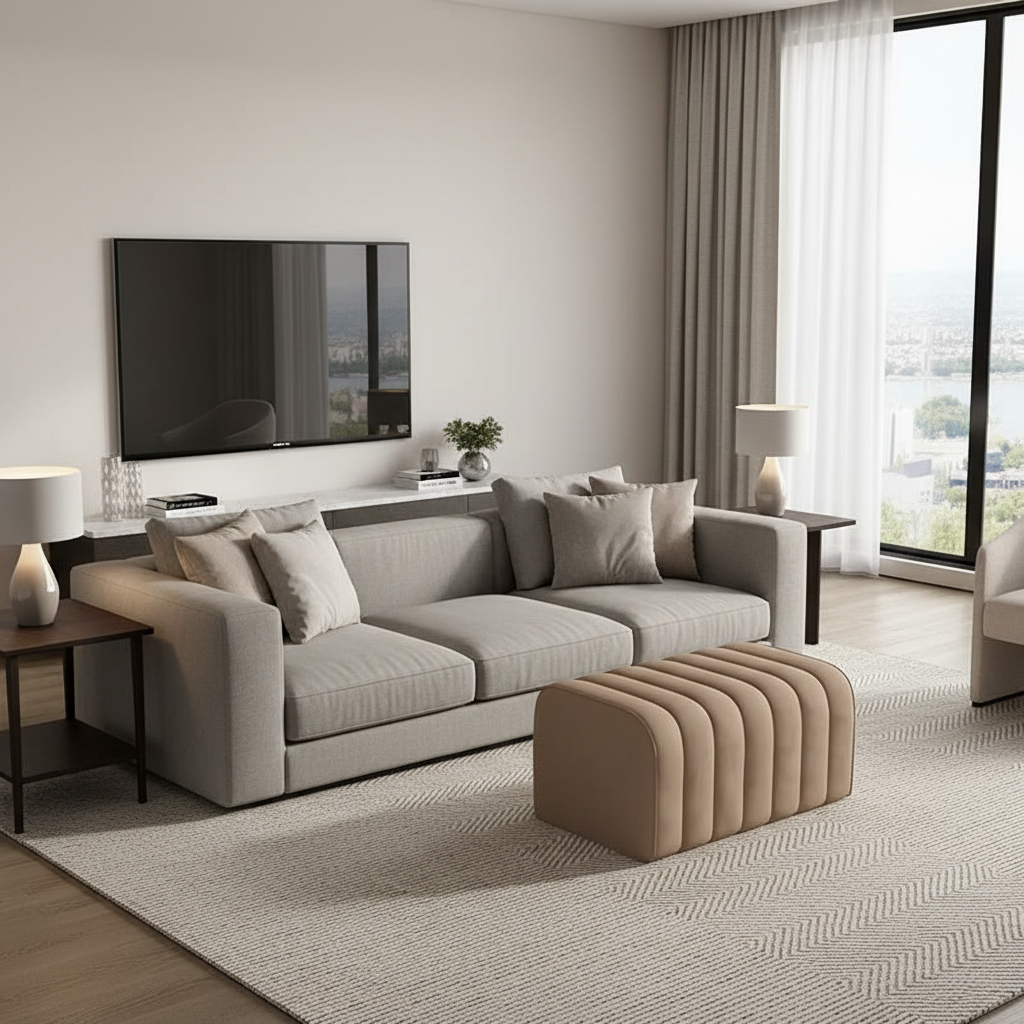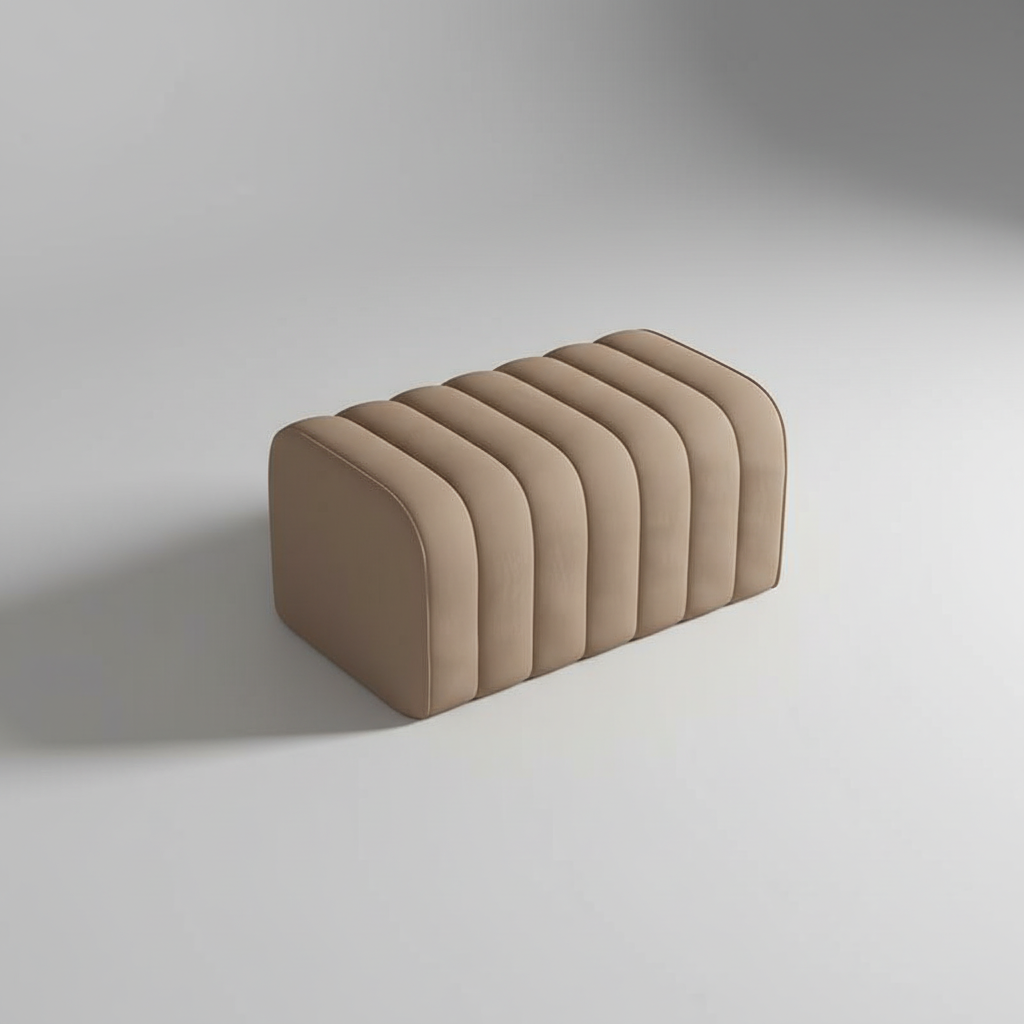Ce repose pied de salon présente un design Nordic épuré, revêtu de velours beige avec une texture canelée. Il est conçu pour apporter un confort supplémentaire et une touche décorative à votre espace de vie.