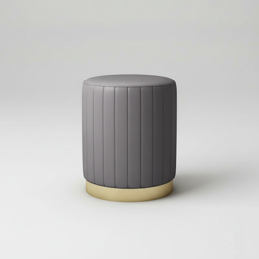 Ce repose pied cylindrique est conçu pour offrir un soutien confortable. Il se caractérise par son revêtement en velours gris et sa base métallique de couleur dorée.