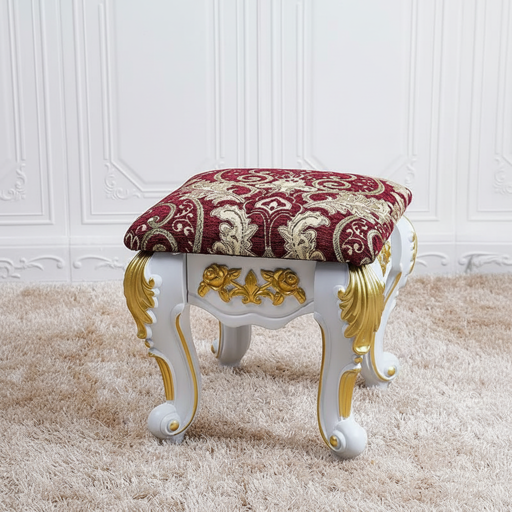 - Matière : Structure en bois laqué blanc avec ornements dorés. Assise rembourrée en tissu type velours à motifs.