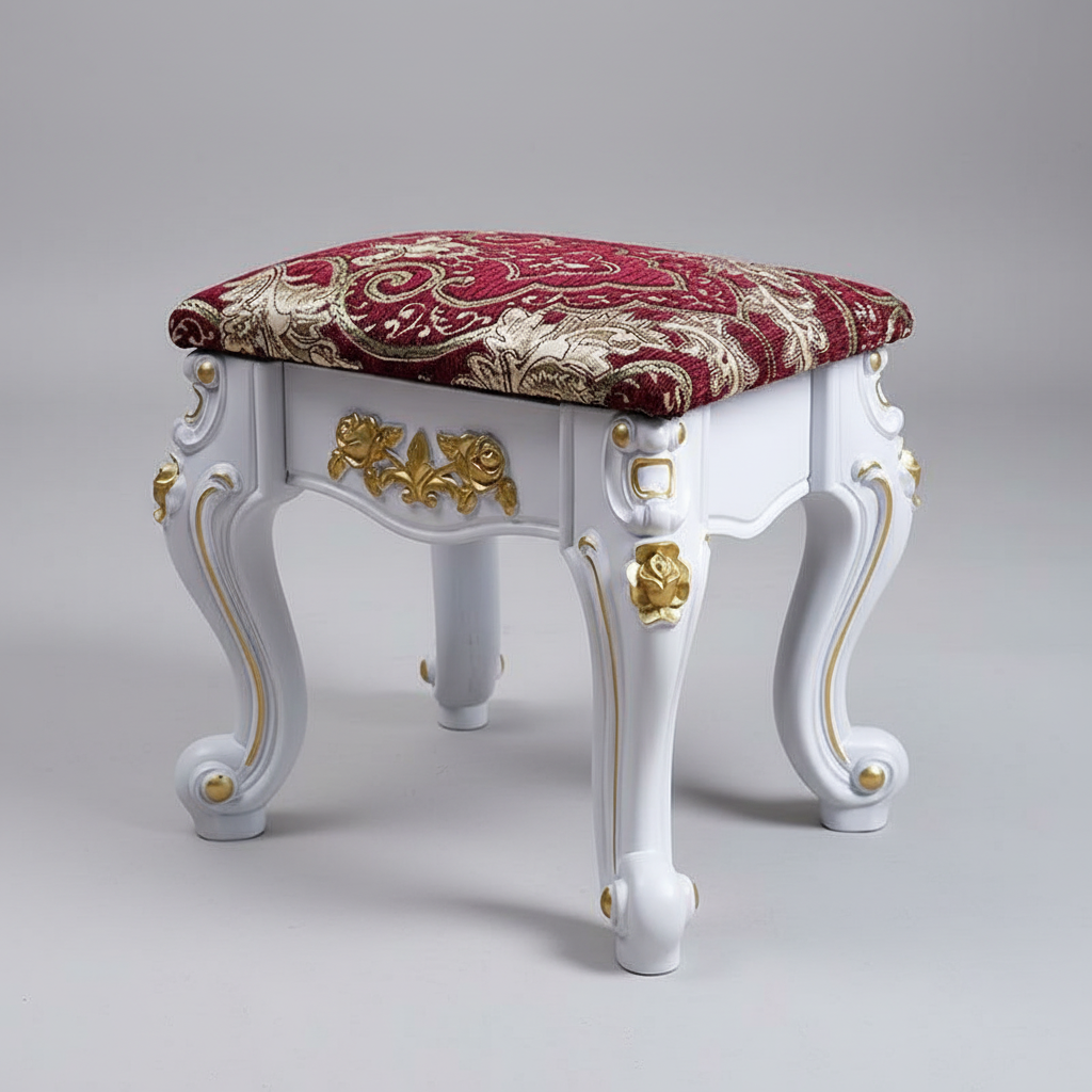 Ce Repose Pied Salon velours doré vintage est un tabouret d'appoint décoratif et fonctionnel. Il se caractérise par son cadre sculpté blanc avec des motifs dorés et son coussin rembourré en tissu à motifs.