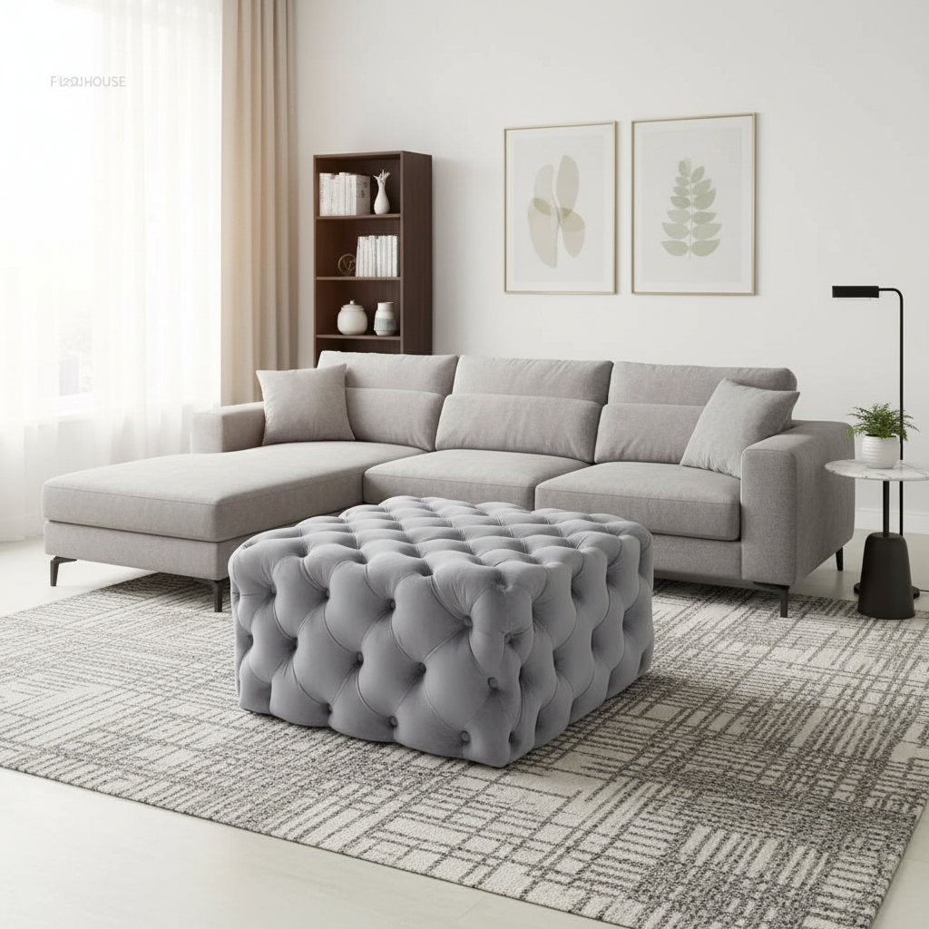 Repose Pied Salon velours gris canapé : Confort et style capitonné