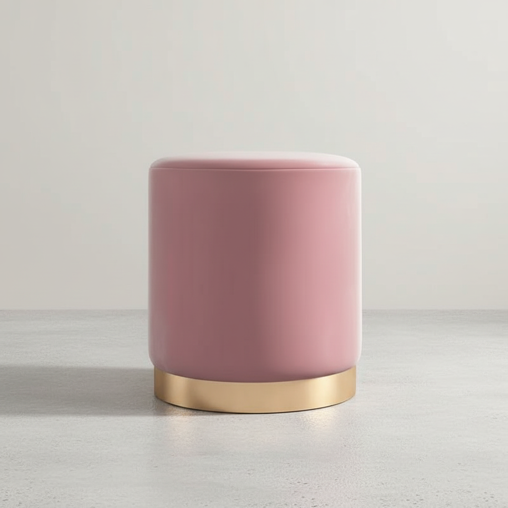 Repose Pied Salon velours rose pouf cylindrique avec base dorée