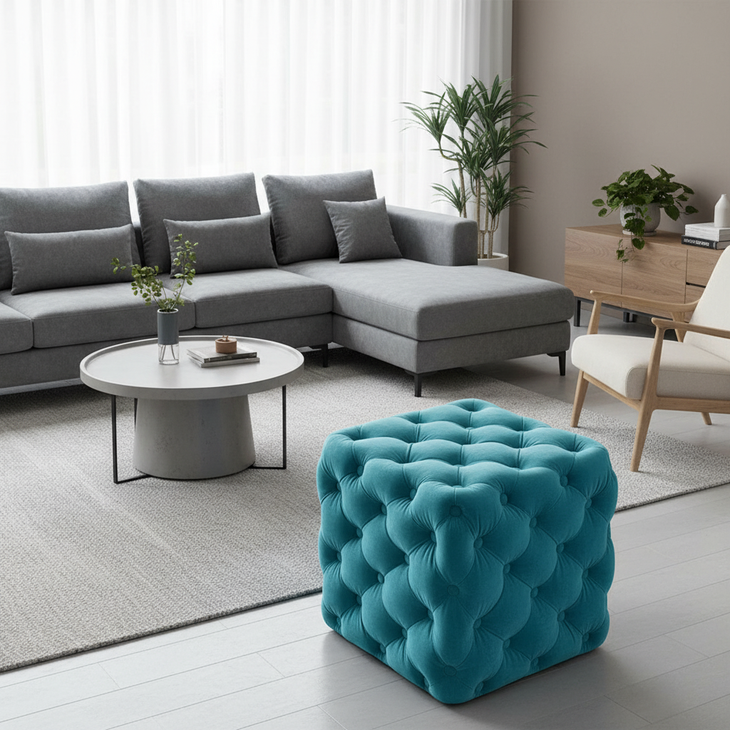 Repose Pied Salon Velours Turquoise Canapé - Pouf capitonné